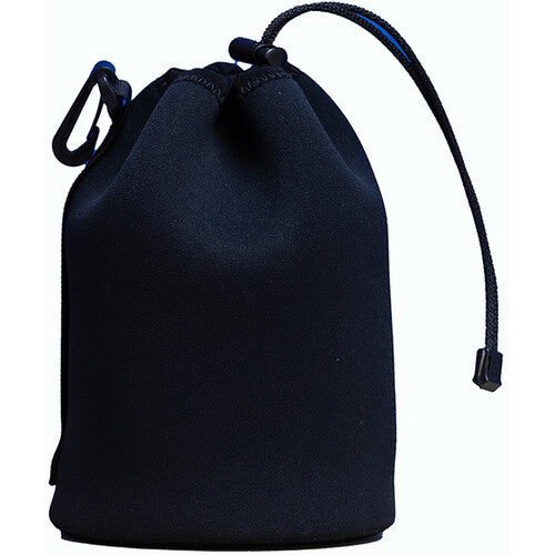The lens pouch features a simple pull-cord closure for retrieving and storing your equipment, a carabiner for clipping the lens pouch to a camera bag or jacket, and a removable reinforced front element protection disc for lenses.