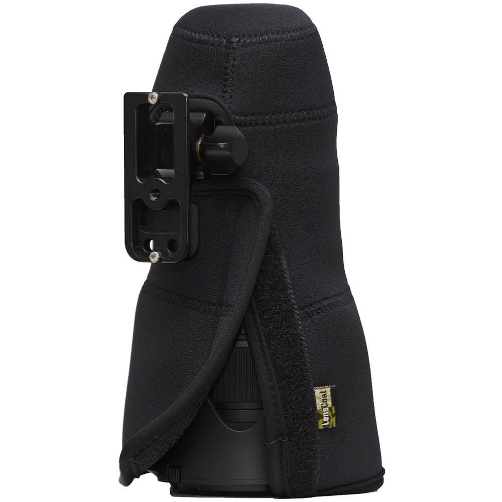 The TravelCoat Cover for the Nikon 70-200 f/2.8 VR/VRII Lens in black is made of 100% closed-cell, shock-absorbing 3mm thick neoprene. Custom tailored to fit your lens, this travel coat provides protection and allows you more valuable room for packing and storage. This cover quickly and easily slides over your lens with a hook-and-loop closure. This cover is designed for use with the lens hood on in the reverse position.