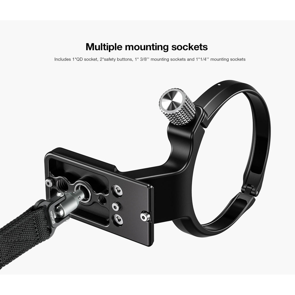 The CF-02 Lens Foot for Canon RF 70-200mm f/2.8 L IS USM from Leofoto offers stability and support for your lens. Designed for the Canon RF 70-200mm f/2.8 L IS USM lens, this piece replaces Canon's original lens collar foot to provide better ergonomics and improved comfort. Constructed with aircraft-grade aluminum, the foot is durably built with an Arca-type dovetail mount with 1/4"-20 and 3/8"-16 mounting sockets with a quick disconnect socket to attach a compatible strap. This lens foot includes two safety stops on the bottom, which prevent accidental lens release when a quick release receiver clamp is partially open.