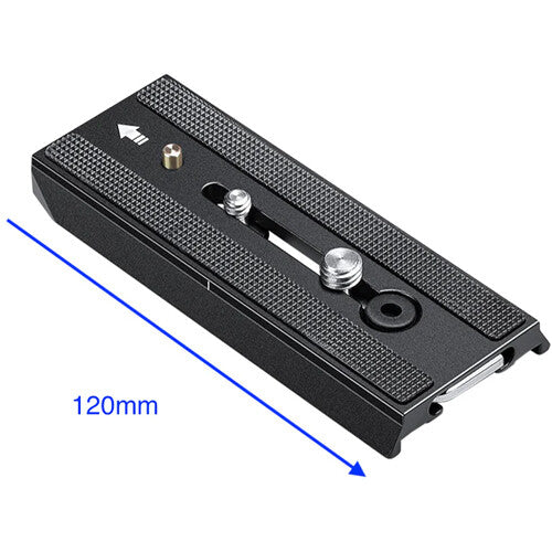 The Leofoto MP-90 Universal Lens Plate is a Manfrotto-standard quick release plate measuring 3.5" long and 2" wide. It comes with 1/4"-20 and 3/8"-16 screws and features an anti-rotation pin.