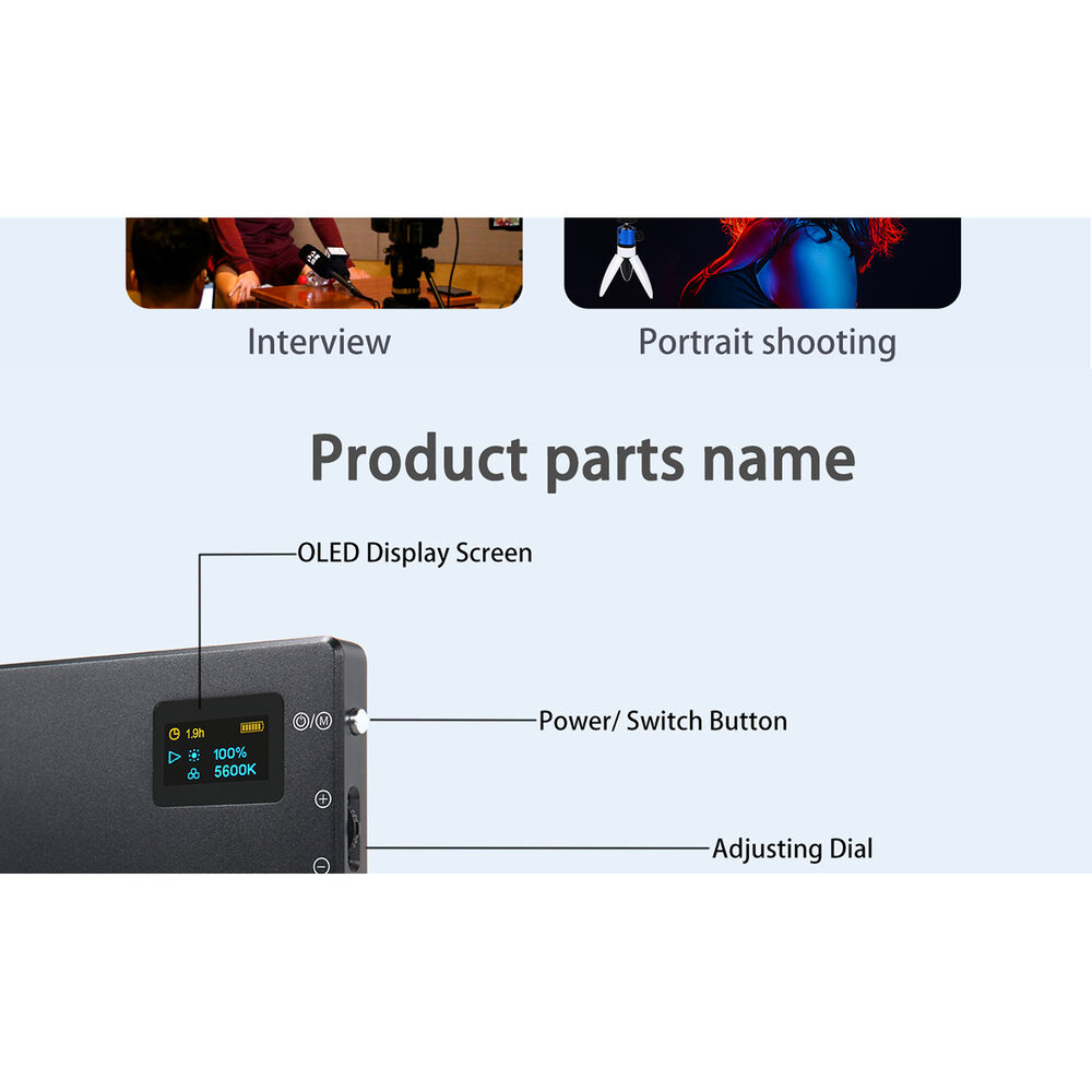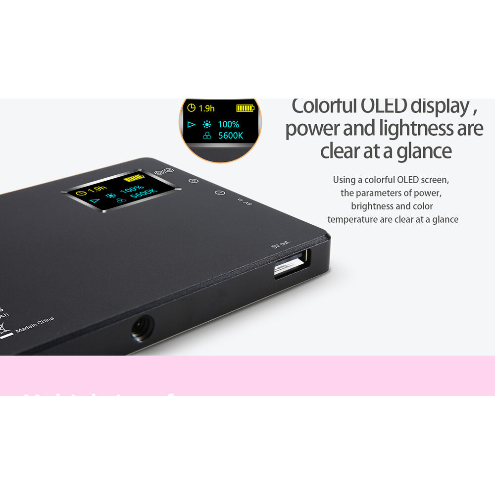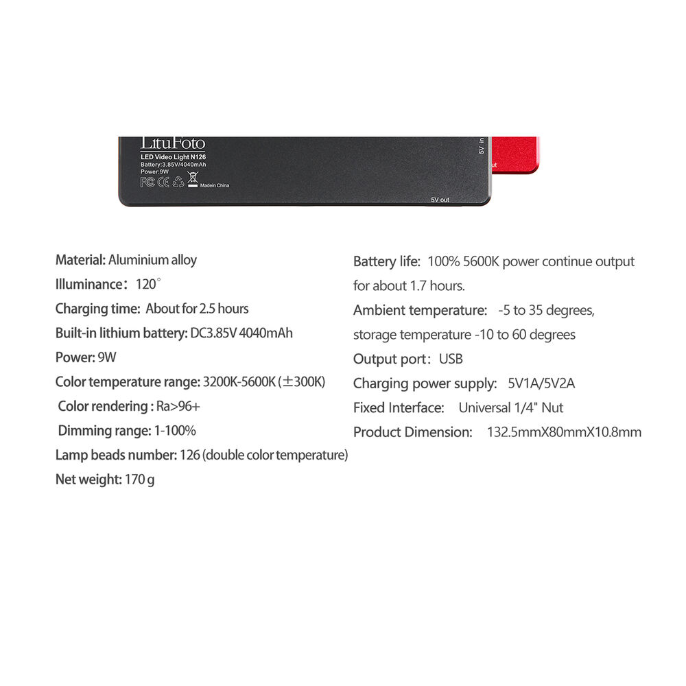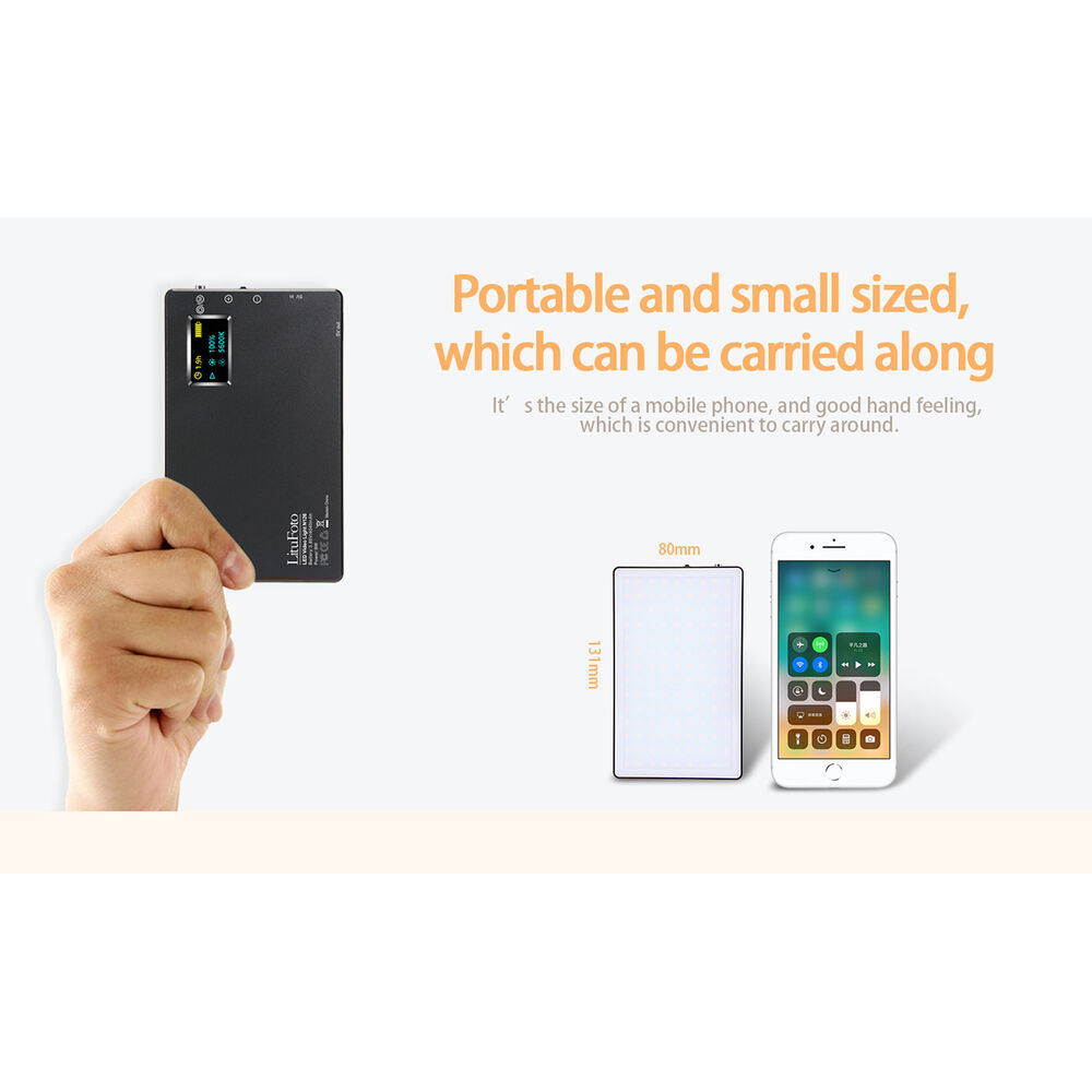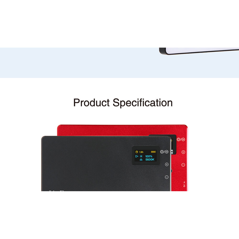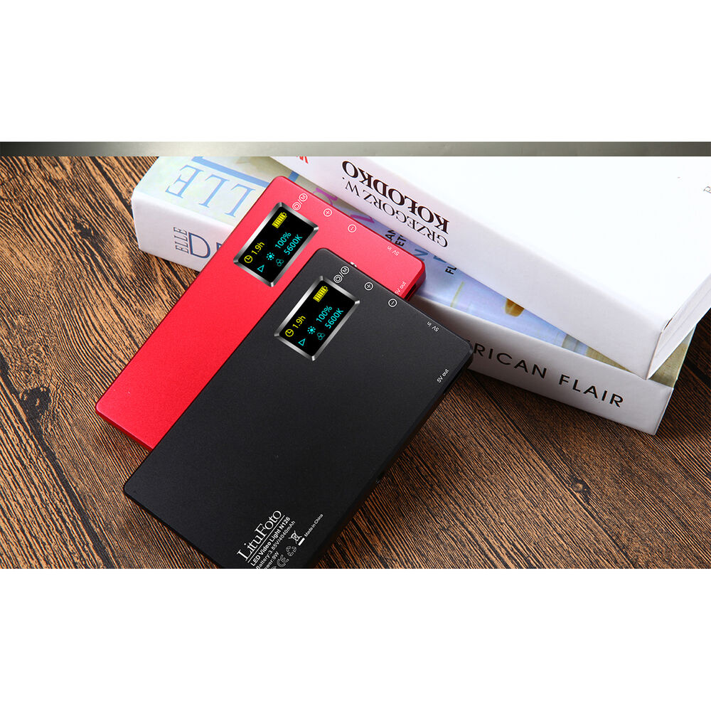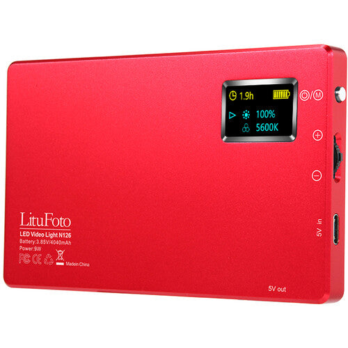 3200 to 5600K Color Temperature, 96+ CRI1-100% Brightness, LCD, Built-In BatteryLess than 1/2" Thick Aluminum HousingFrosted Lens Layer, OLED Display Screen The LituFoto LED Bi-Color Video Light , in a red aluminum chassis, is about the size of a 3 x 5" index card and less than 1/2" thick. It features a frosted diffusion filter and an OLED display screen on the back. The fixture uses two-color LEDs to achieve an adjustable color temperature output of 3200 to 5600K with a 96+ CRI rating. The light has a push-button on/off switch and a manual adjustment dial, which allows you to adjust the color temperature and the brightness from 1 to 100% brightness.
