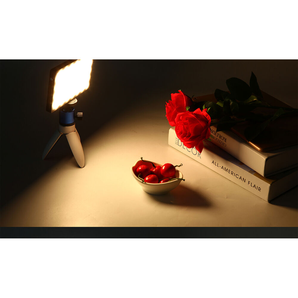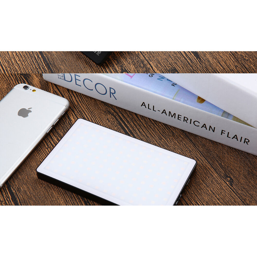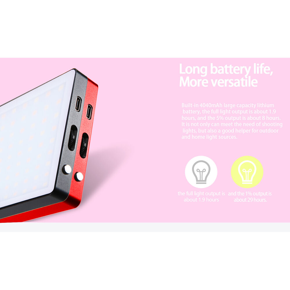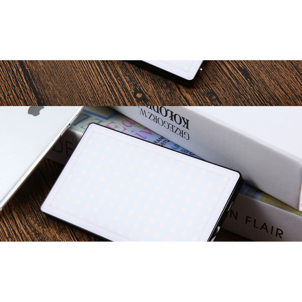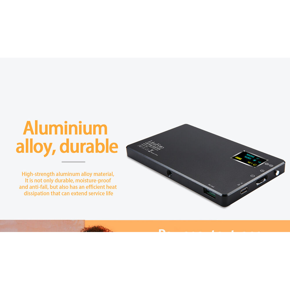 3200 to 5600K Color Temperature, 96+ CRI1-100% Brightness, LCD, Built-In BatteryLess than 1/2" Thick Aluminum HousingFrosted Lens Layer, OLED Display Screen The LituFoto LED Bi-Color Video Light , in a red aluminum chassis, is about the size of a 3 x 5" index card and less than 1/2" thick. It features a frosted diffusion filter and an OLED display screen on the back. The fixture uses two-color LEDs to achieve an adjustable color temperature output of 3200 to 5600K with a 96+ CRI rating. The light has a push-button on/off switch and a manual adjustment dial, which allows you to adjust the color temperature and the brightness from 1 to 100% brightness.