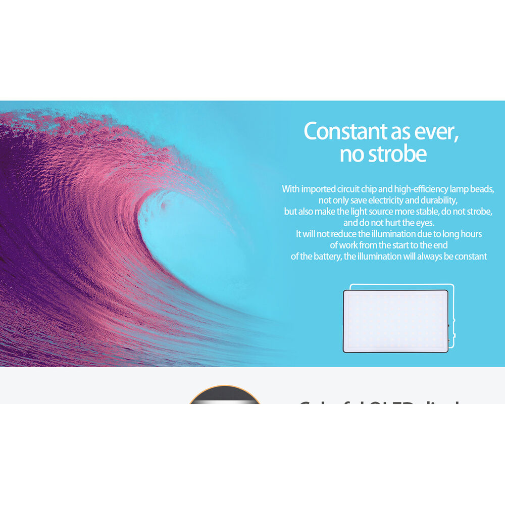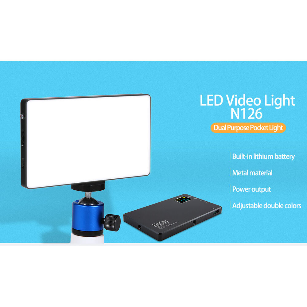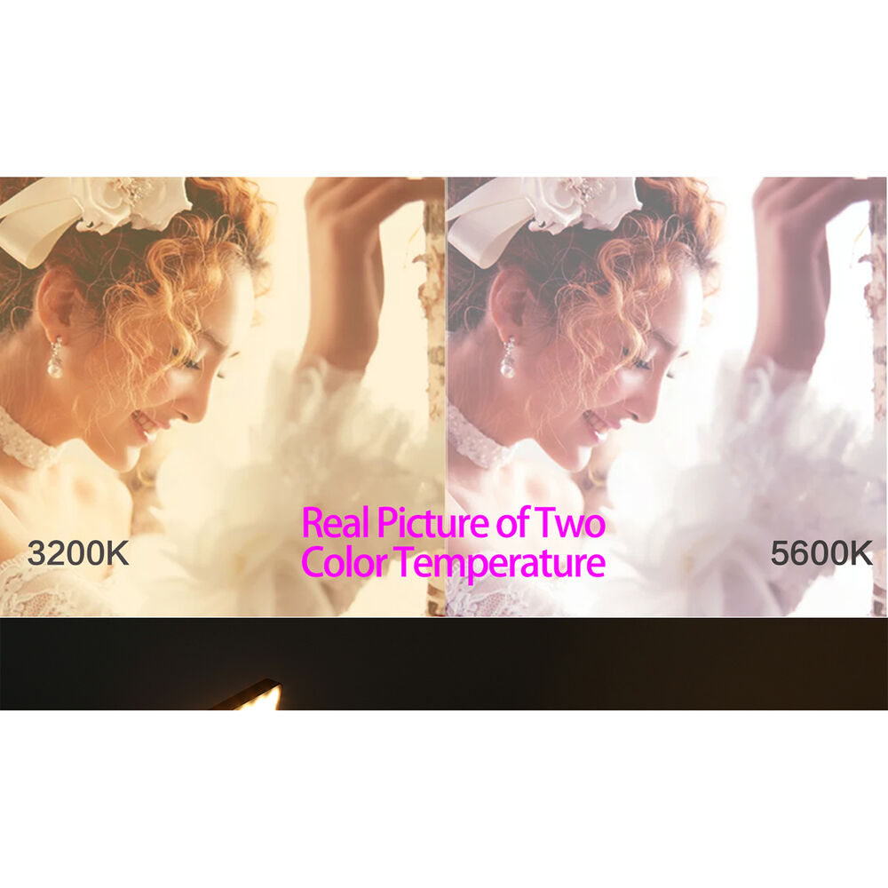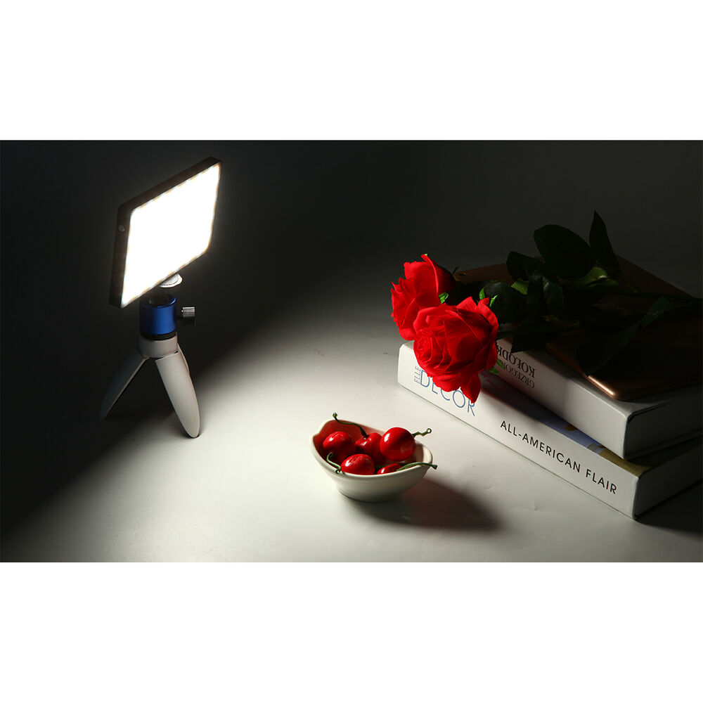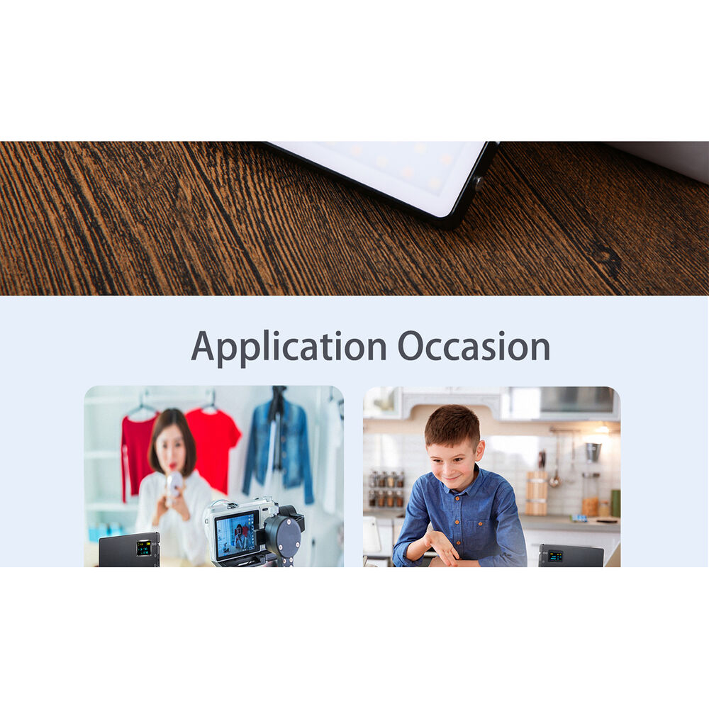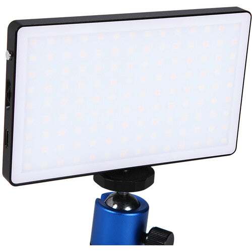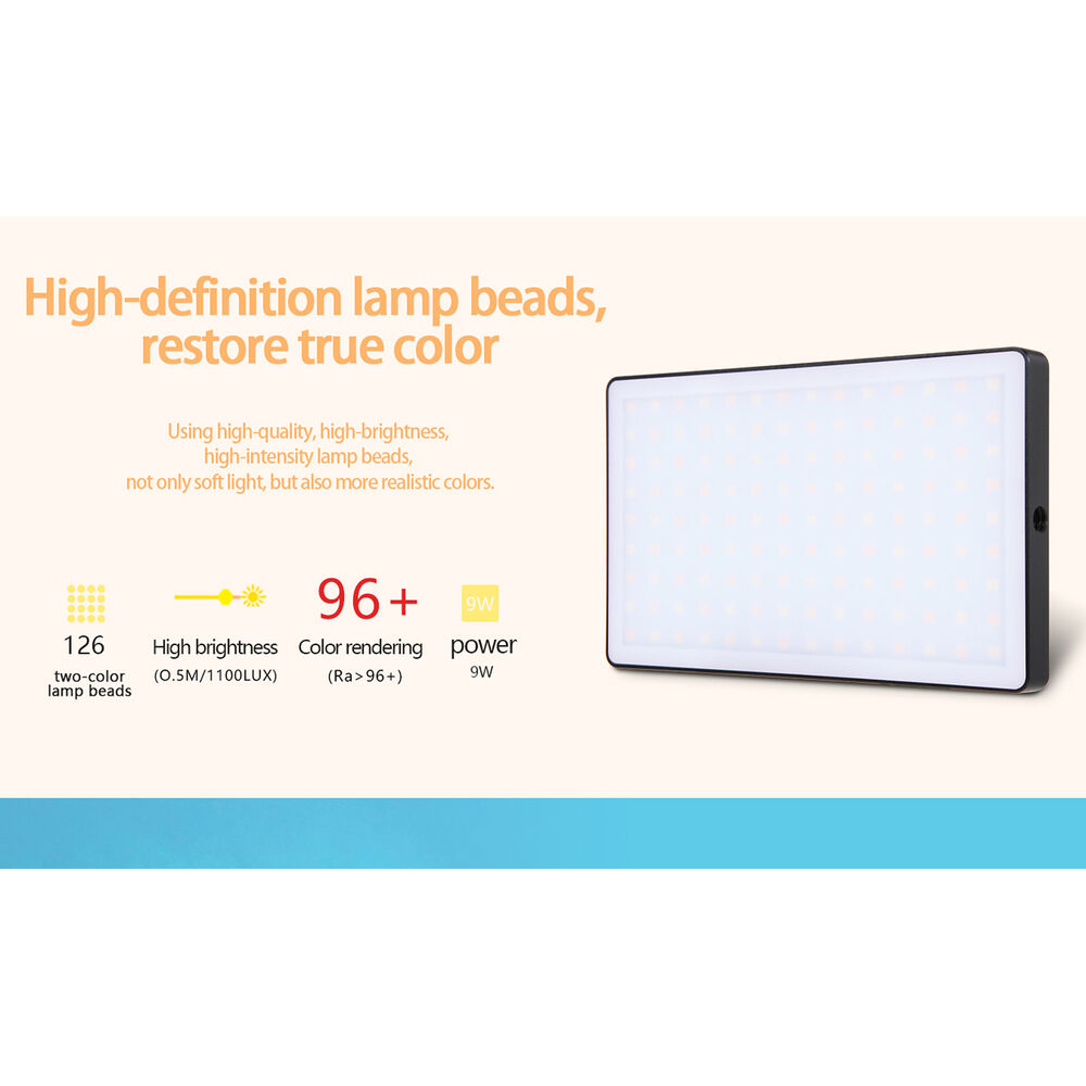 3200 to 5600K Color Temperature, 96+ CRI1-100% Brightness, LCD, Built-In BatteryLess than 1/2" Thick Aluminum HousingFrosted Lens Layer, OLED Display Screen The LituFoto LED Bi-Color Video Light , in a red aluminum chassis, is about the size of a 3 x 5" index card and less than 1/2" thick. It features a frosted diffusion filter and an OLED display screen on the back. The fixture uses two-color LEDs to achieve an adjustable color temperature output of 3200 to 5600K with a 96+ CRI rating. The light has a push-button on/off switch and a manual adjustment dial, which allows you to adjust the color temperature and the brightness from 1 to 100% brightness.