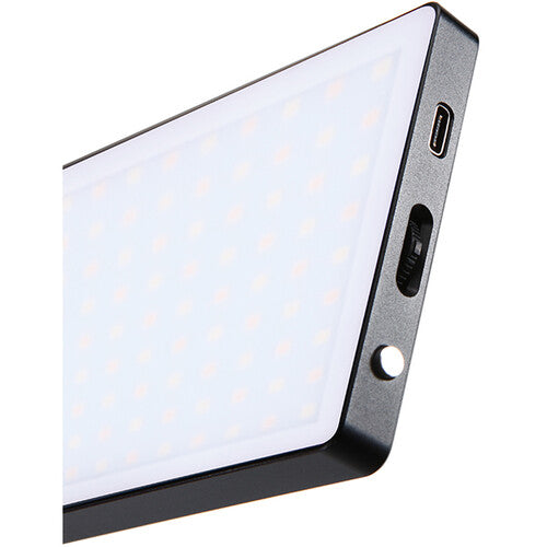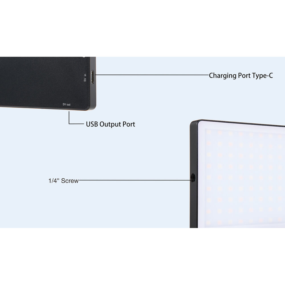 The OLED screen on the back of the light displays a battery gauge, remaining power in hours at current brightness, color temperature, and brightness. An integrated frosted lens softens the light's output, creating a soft source without multiple shadows. The integrated battery will last about 1.7 hours at full power at 5600K, and it takes about 2.5 hours to fully recharge via the USB Type-C port. Two 1/4"-20 mounting threads, one on the side and one on the bottom, enable horizontal and vertical mounting. A built-in USB Type-A port provides power to other devices.