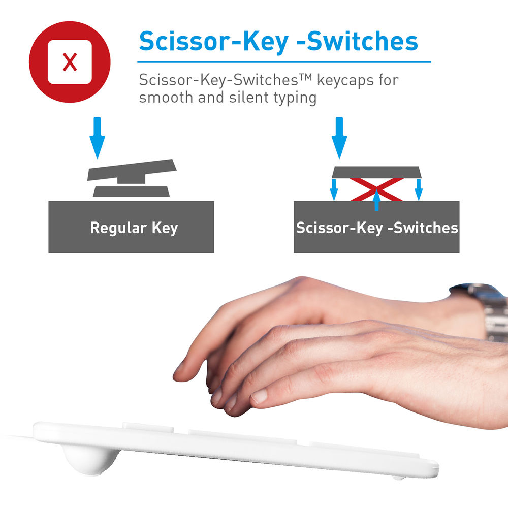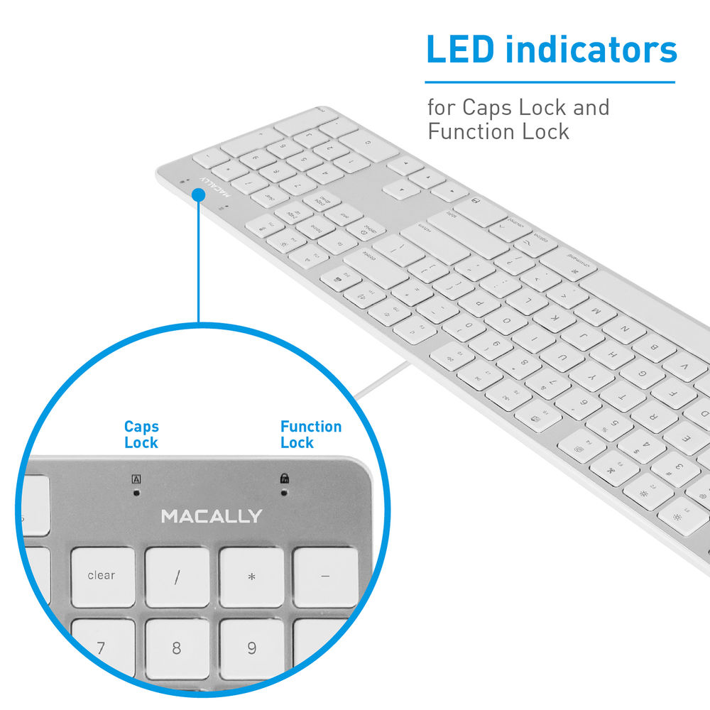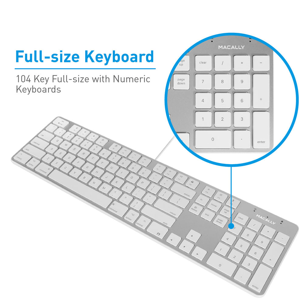 The 104-Key Slim USB Keyboard for Mac from Macally is a wired USB keyboard . The keyboard features 104 full-size and thin keys for a comfortable typing experience. There are 16 shortcut keys for launching Mac OS X applications at the touch of a finger and LED indicators for caps lock, number lock and shortcut. Simply plug the keyboard into a USB Type-A port on your computer and you can start using it right away. Additionally, the keyboard has a slim profile that allows it to store easily when you're not using it.