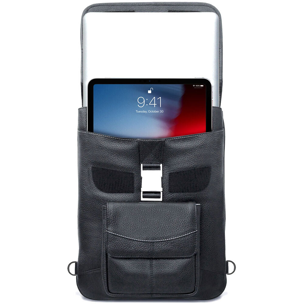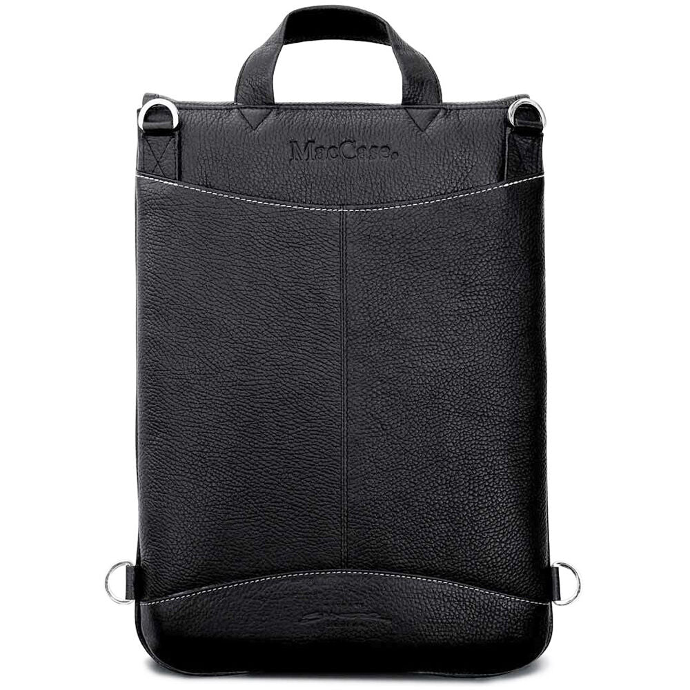 This Flight Jacket is iconic, rugged, compact, and functional. A true original. Custom-designed and handcrafted for the Apple MacBook, it is black and made of leather. Compact and durable, it has a padded shoulder strap and top handle. Dimensions: 16.25"H x 11.25"W x 0.75"D. Laptop pocket holds a laptop up to 16" and is padded for additional protection. Classic pebble grain, black satin. Organizer panel in pocket with dedicated storage for cards, pens, and other accessories. Removable front storage pouch. Shoulder strap is also removable. Lifetime-lifetime manufacturer's warranty