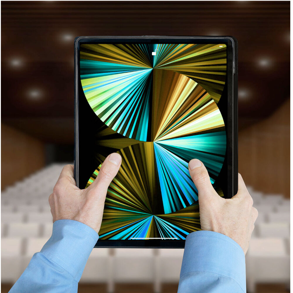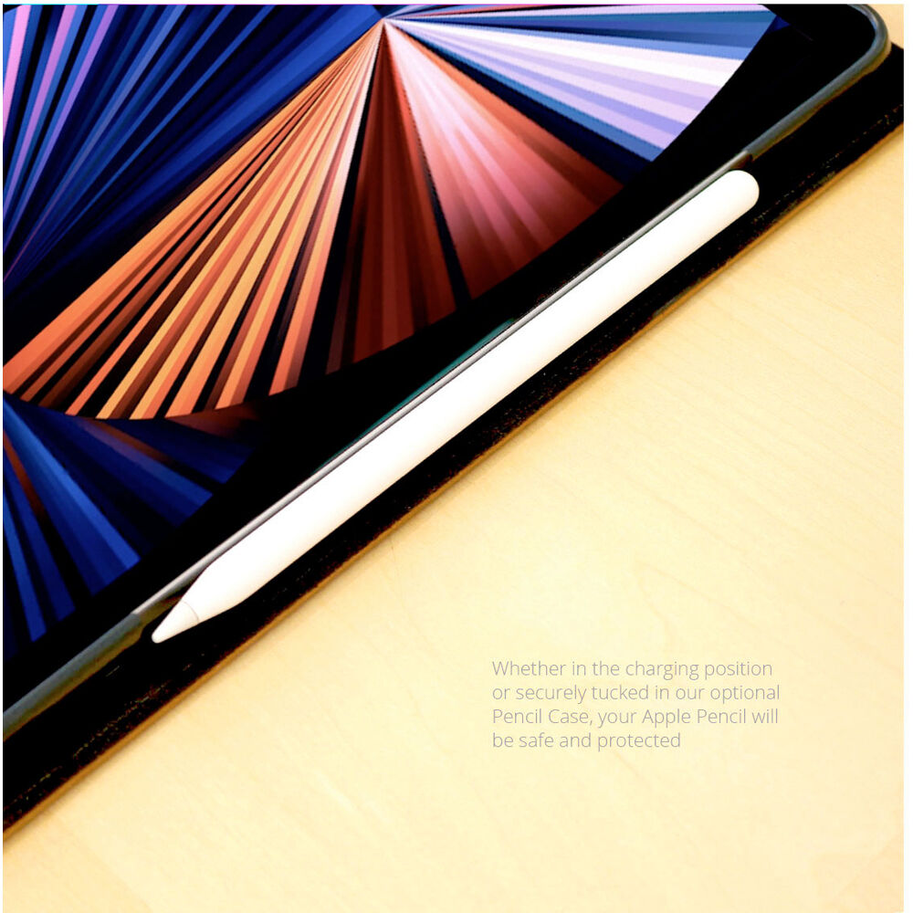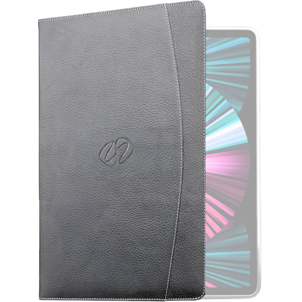 The black MacCase Leather Folio Case for 12.9" iPad Pro Gen 5 and 6 features a handcrafted leather construction and impact-resistant polymer tray. Holding an optional Apple Pencil in the charging position, it provides 70° viewing angle adjustability, with the cover slowly folding back onto itself like a magazine. The padded cover supports auto wake and sleep functionality, while the suede interior protects your iPad. This case closes using a magnetic clasp and is designed to preserve access to your iPad's rear camera.