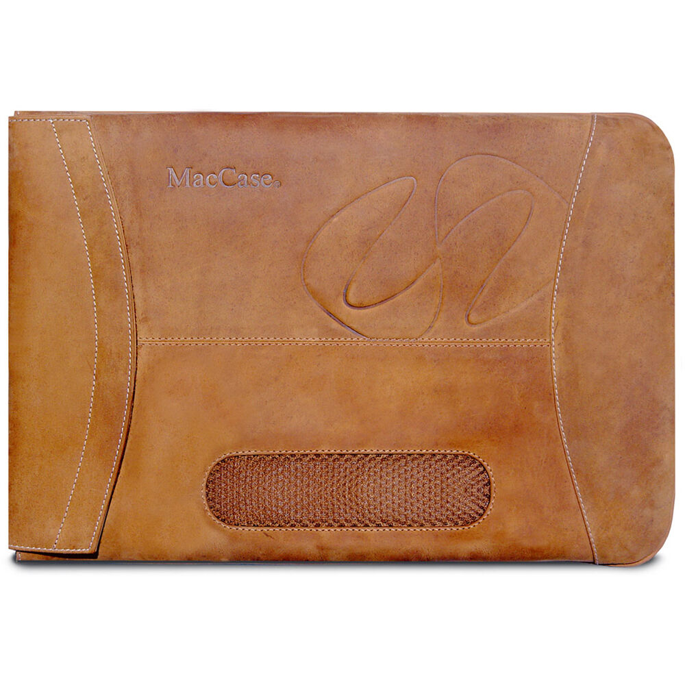 Stay fashionable while protecting your 14.2" MacBook Pro from scratches and bumps with this unfinished, vintage brown Premium Leather Sleeve from MacCase. This handcrafted sleeve is designed for anyone looking for high-quality protection when transporting their laptop in a larger bag, such as a shoulder bag, backpack, or roller. The window shows off the Apple logo, while the rear vent keeps your MacBook cool after use. Made from ethically sourced, top-grain, vegetable-dyed premium leather, this sleeve has a fully padded and poly-suede lined interior, an air-filled perimeter bumper for extra protection, and a color matched hook-and-loop fastener closure to ensure your Mac won't slip out.