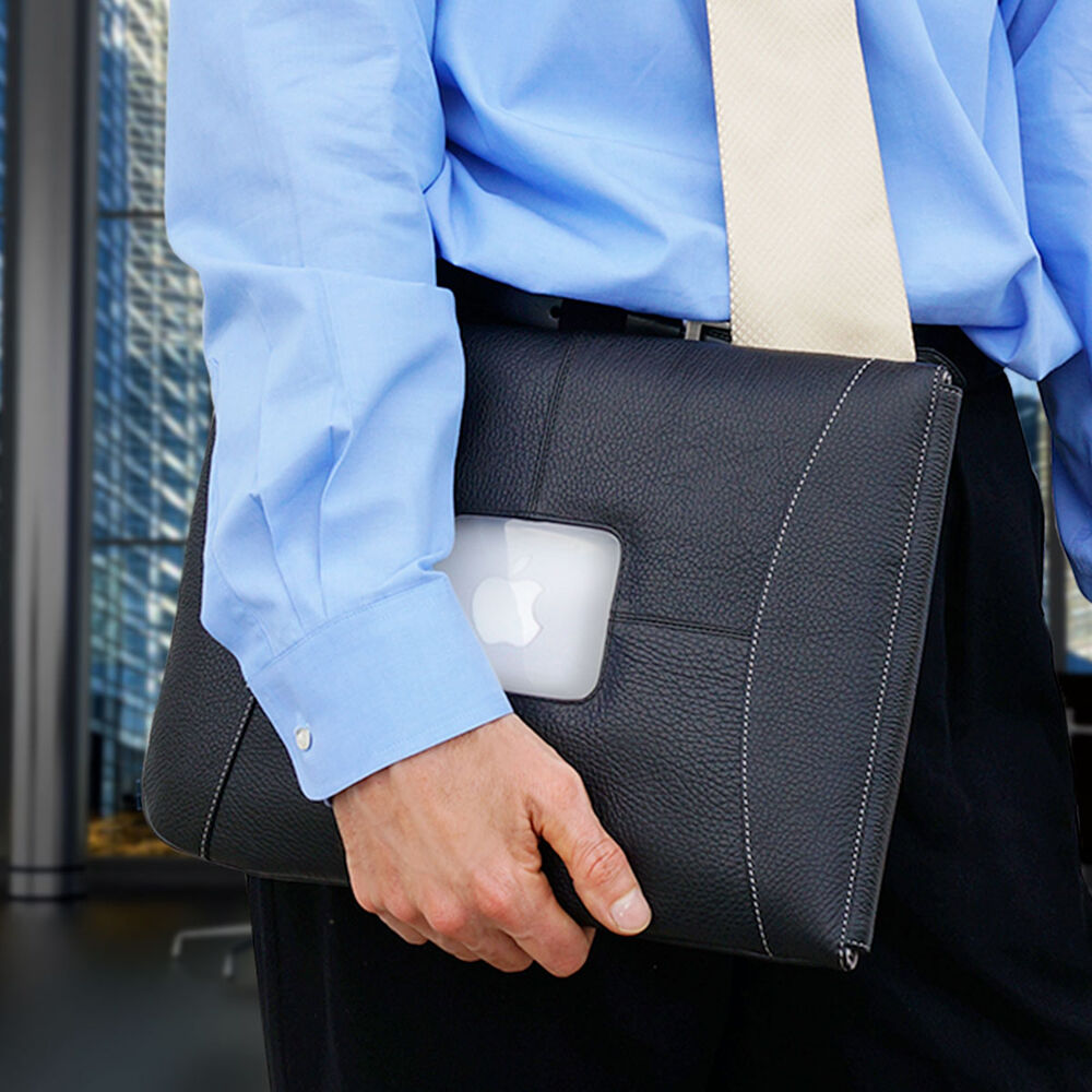 Stay fashionable while protecting your 16.2" MacBook Pro from scratches and bumps with this pebble grain, satin black Premium Leather Sleeve from MacCase. This handcrafted sleeve is designed for anyone looking for high-quality protection when transporting their laptop in a larger bag, such as a shoulder bag, backpack, or roller. The window shows off the Apple logo, while the rear vent keeps your MacBook cool after use. Made from ethically sourced, top-grain, vegetable-dyed premium leather, this sleeve has a fully padded and poly-suede lined interior, an air-filled perimeter bumper for extra protection, and a color matched hook-and-loop fastener closure to ensure your Mac won't slip out.