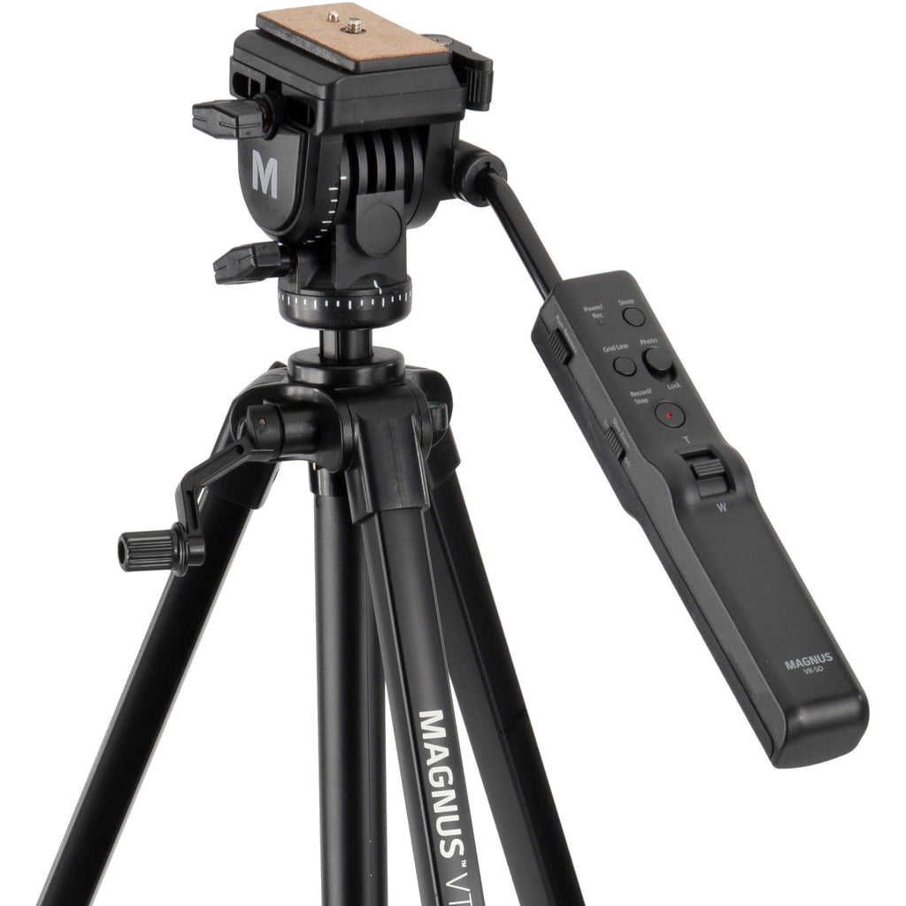 The Magnus VT-100 Tripod Kit with Pan Handle Video Remote has been assembled by to provide you with a stable anodized aluminum video tripod that can support loads up to 4.4 lb, as well as a remote control for select Sony cameras or camcorders. Pan and tilt to follow your on-camera talent or create visually stunning smooth, cinematic shots to immerse your audience in your film. The remote control allows you to start/stop the camera and control the zoom for smooth servo-controlled moves. The remote can be used while mounted on the tripod pan handle or held freely and not attached to the tripod.
