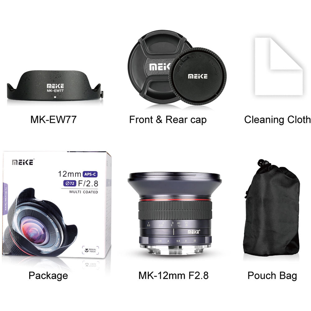 Presenting a dramatic wide-angle field of view, the Sony E-mount MK-12mm f/2.8 Lens from Meike is an 18mm equivalent lens featuring a relatively bright f/2.8 maximum aperture to balance low-light performance with a compact form factor. Individual lens elements feature a multi-layer nano coating to control surface reflections, flare, and ghosting in order to realize a high degree of contrast and color accuracy, even when working in bright and backlit conditions. Additionally, the lens sports a manual focus design along with minimum focusing distance of 3.9" for working with close-up subjects.