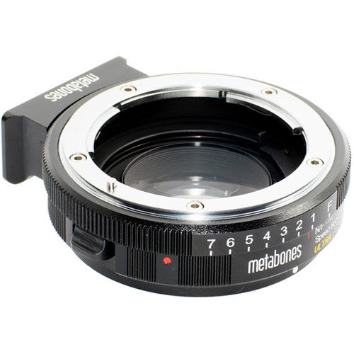 The Speed Booster Ultra 0.71x Adapter for Nikon F-Mount Lens to Micro Four Thirds-Mount Camera from Metabones allows a full-frame or APS-C Nikon F-mount lens to be mounted onto a Micro Four Thirds-mount camera. While doing so, the adapter's optics help to maximize the connected lens's apparent angle of view while providing a 1-stop increase for the camera over the lens's aperture range.