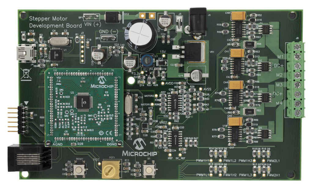 dsPICDEM� MCSM Development Board is targeted to control both unipolar and bipolar stepper motors in open-loop or closed-loop (current control) mode. The hardware is designed in such a way that no hardware changes are necessary for 8-, 6- or 4-wire stepper motors in either bipolar or unipolar configurations. Software to run motors in open-loop or closed-loop with full or variable micro-stepping is provided. A GUI for controlling step commands, motor parameter input, and operation modes is included. This flexible and cost-effective board can be configured in different ways for use with Microchip's specialized dsPIC33 Motor Control Digital Signal Controllers (DSCs).