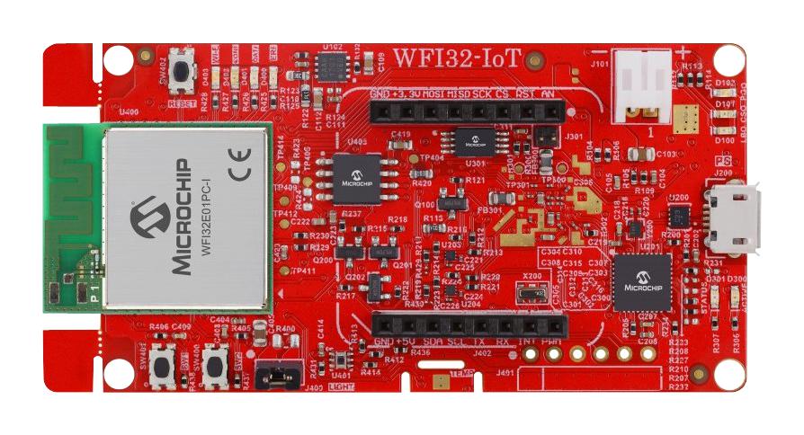EV36W50A is a WFI32-IoT board. The WFI32-IoT board is a compact, stand-alone and easy-to-use board that helps the user to develop the Internet of-Things (IoT) applications with the WFI32E01PC module, a highly integrated Wi-Fi® MCU module that supports smart Wi-Fi functionalities and premium MCU features. The WFI32E01PC module has a PCB antenna and Trust&GO hardware secure element, which is pre-provisioned to popular cloud platforms.