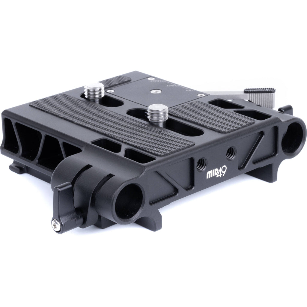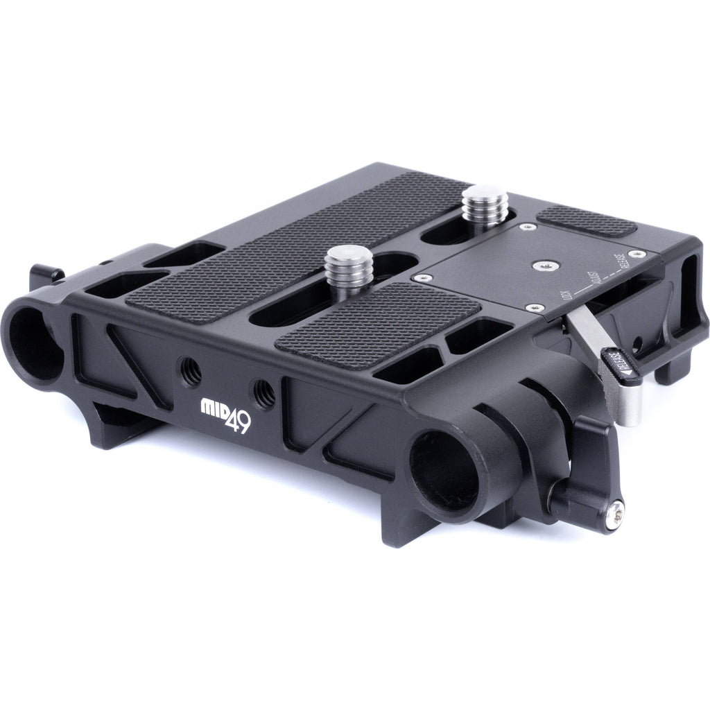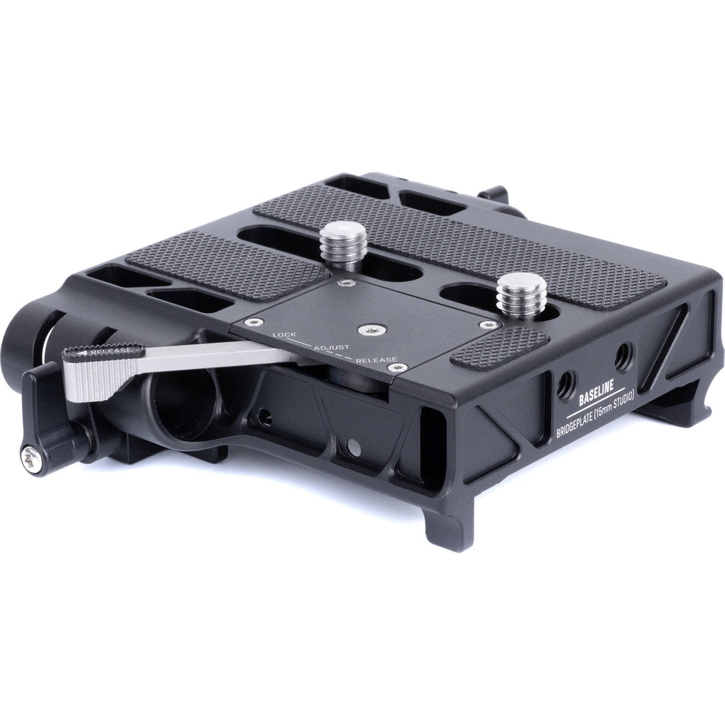 This 15mm Studio MID49 Baseline Bridgeplate for 15mm rods is compatible with standard ARRI dovetails. It features a familiar lock and unlock lever for balancing your camera along the dovetail plate. In addition, the locking lever can be extended allowing you to remove the baseplate directly from the dovetail rails and not have to slide it off the back, although you can if you wish. The lever lock system also allows you to directly mount the baseplate on the dovetail rails without sliding it on from the back.