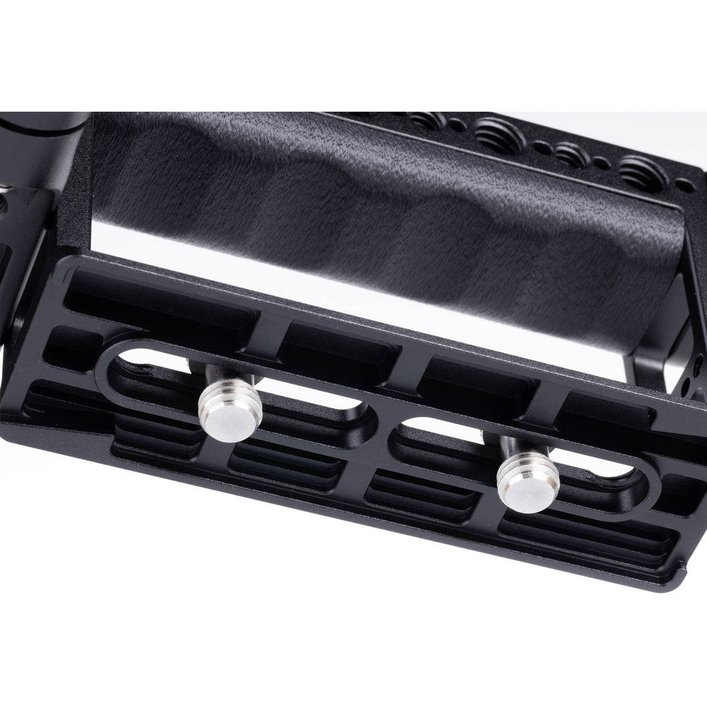 The purple Mid49 Rainbow Handle Kit is a modular handle system that can be configured in a variety of ways, including bending down behind the battery, commonly referred to as a Hollywood or Panavision-style handle. Each component is compatible with any 3/8"-16 ARRI accessory mount, the anti-twist pins securely lock the handle components solidly so there is no play. The components feature 1/4"-20 and 3/8"-16 threaded holes, with anti-twist divots and multiple M4 x 20mm threaded holes. Pop out the rubberized purple grip and swap with another color if you need to change the color coding. The Arca-Swiss dovetail shape on the main handle section interfaces with any MID49 Top Plate or Upper Cage and many 3rd party Arca clamps.