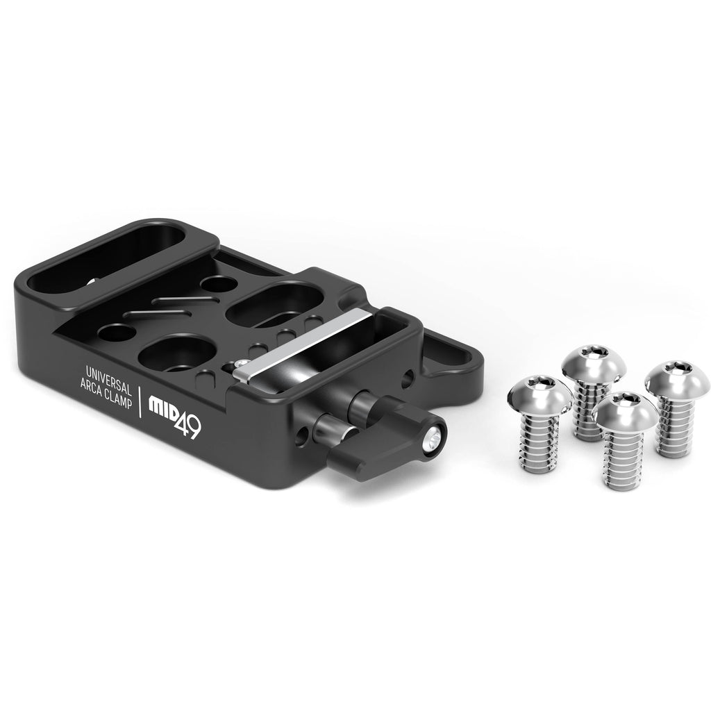 The MID49 Universal Arca Clamp is a universal Arca-type clamp compatible with most tripod and gimbal heads, attaching via 1/4"-20 and 3/8"-16 mounting threads. Front-to-back and side-to-side screw channels allow the clamp to be bolted down with four included 1/4"-20 screws. The front-to-back channel accommodates spacing up to 30mm, while the side-to-side channel accommodates spacing up to 60mm.