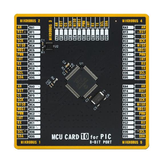 MIKROE-4226 is a MCU card 10 for PIC PIC18F67K40. MCU card is a standardized add-on board, which allows very simple installation and replacement of the microcontroller unit (MCU) on a development board equipped with the MCU card socket. By introducing the new MCU card standard, we have ensured the absolute compatibility between the development board and any of the supported MCUs, regardless of their pin number and compatibility. MCU cards are equipped with two 168-pin mezzanine connectors, allowing them to support even MCUs with extremely high pin count. Their clever design allows very simple usage, following the well-established plug & play concept of the Click board� line of product.
