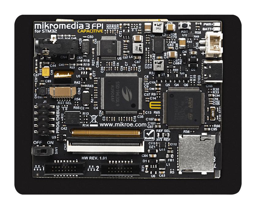 mikromedia 3 for STM32 CAPACITIVE FPI with bezel is a compact development board designed as a complete solution for the rapid development of multimedia and GUI-centric applications. By featuring a 3.5" capacitive touch screen driven by the powerful graphics controller that can display the 24-bit colour palette (16.7 million colours), along with a DSP-powered embedded sound CODEC IC, represents a perfect solution for any type of multimedia application. The mikromedia 3 for STM32 CAPACITIVE FPI features USB, digital motion sensor, battery charging functionality, SD-Card reader, and much more, expanding its use beyond the multimedia. Two compact-sized mikroBUS Shuttle connectors represent the most distinctive connectivity feature, allowing access to a huge base of Click boards�.
