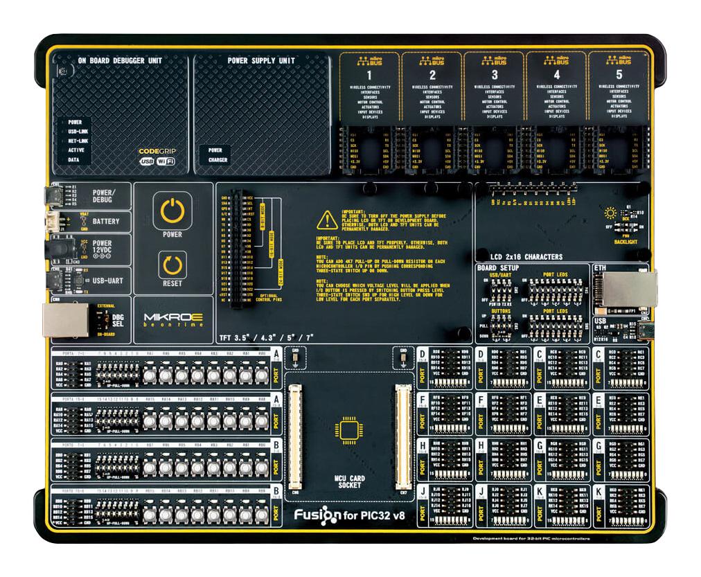 Fusion for PIC32 v8 is a development board designed for rapid development of embedded applications. Redesigned from the ground up, it offers broad set of standard, as well as several unique features never seen before in the world of embedded electronics: programming and debugging over Wi-Fi network, support for a large number of PIC32 MCus regardless of their pin number. The development board is designed so that the developer has everything that might be needed for the application development, following the Swiss Army knife concept: a highly advanced programmer/debugger module, powerful and clean power supply module, a huge set of connectivity options including USB, Ethernet, CAN (on the MCU Card, if supported), UART, as well as set of Mikroe proprietary standards and technologies, including the well-established mikroBUS� standard, a standardized MCU Card socket and a standardized 2x20 display connector. A number of interactive options available such as buttons, LEDs, switches.