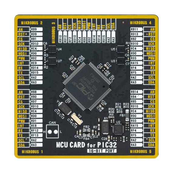 MIKROE-4590 is a MCU card for PIC32 PIC32MX695F512L. MCU card is a standardized add-on board, which allows very simple installation and replacement of the microcontroller unit (MCU) on a development board equipped with the MCU card socket. By introducing the new MCU card standard, we have ensured the absolute compatibility between the development board and any of the supported MCUs, regardless of their pin number and compatibility. MCU cards are equipped with two 168-pin mezzanine connectors, allowing them to support even MCUs with extremely high pin count. Their clever design allows very simple usage, following the well-established plug & play concept of the Click board� line of product.