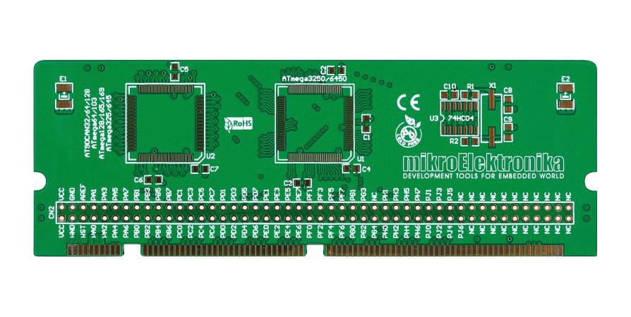 MIKROE-460 is a BIGAVR6 100-pin 1 MCU card empty PCB that enable you to solder different AVR microcontrollers in TQFP package and other electronic components on it. There are pads connected to the microcontroller pins provided on this board. These pads make the placement of MCU cards on the target device easy.