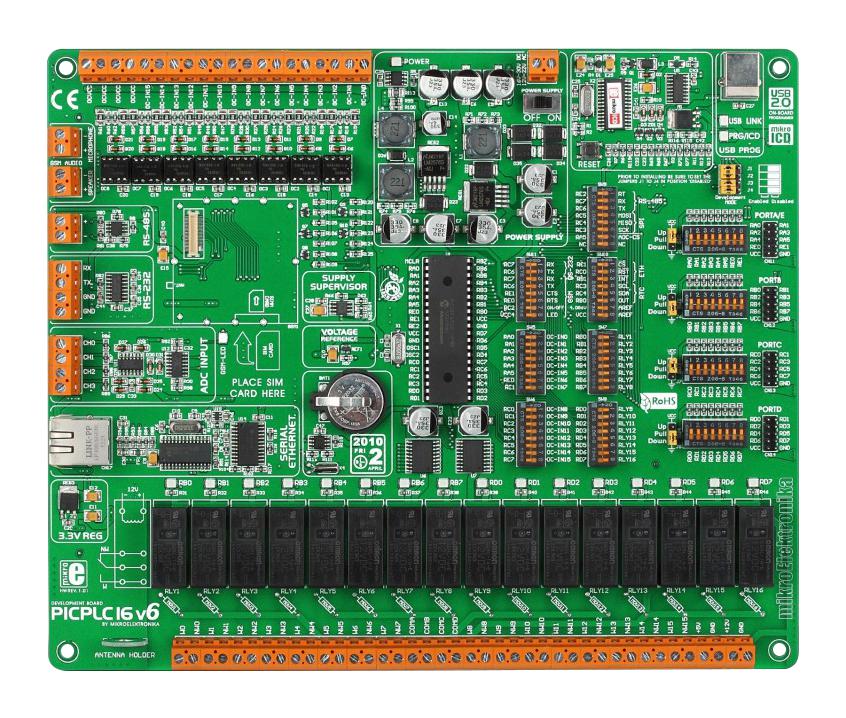PICPLC16 v6 is a PLC system with 16 opto-inputs and 16 relays (for currents up to 16A). With it, you can develop PIC-based industrial, home or office automation devices the easy way-PICPLC16 has all the MikroElektronika features you're familiar with: on-board programmer and mikroICD debugger, clear silkscreen markings and many on-board modules. mikroICD� on board - PICPLC16 has a built-in powerful mikroICD debugger for testing the executed program in real time at hardware level. Whether you are a beginner, or a well-trained professional, this remarkable feature is an irreplaceable advantage.