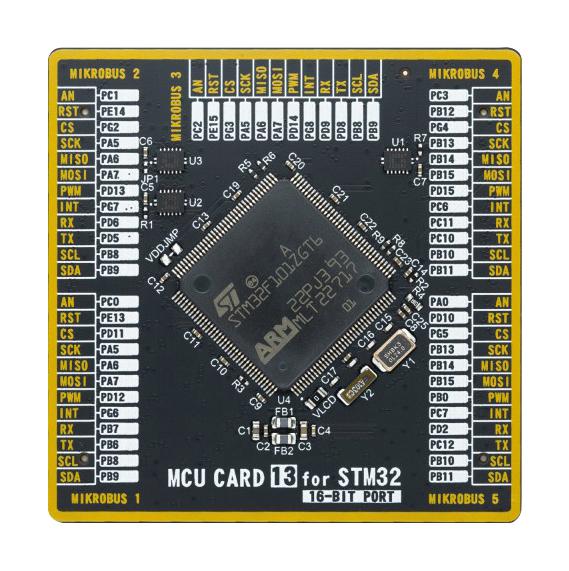MIKROE-4657 is a MCU card 13 for STM32 STM32F101ZG. MCU card is a standardized add-on board, which allows very simple installation and replacement of the microcontroller unit (MCU) on a development board equipped with the MCU card socket. By introducing the new MCU card standard, we have ensured the absolute compatibility between the development board and any of the supported MCUs, regardless of their pin number and compatibility. MCU cards are equipped with two 168-pin mezzanine connectors, allowing them to support even MCUs with extremely high pin count. Their clever design allows very simple usage, following the well-established plug & play concept of the Click board� line of product.