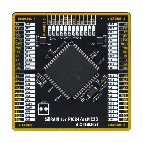MIKROE-4660 is a SIBRAIN for PIC24EP512GU814. SiBRAIN is a standardized microcontroller add-on board, which allows very simple installation and replacement of the microcontroller unit (MCU) on a development board equipped with the SiBRAIN Card socket. By introducing the new SiBRAIN standard, we have ensured the absolute compatibility between the development board and any of the supported MCUs, regardless of their pin number and compatibility. SiBRAIN is equipped with two 168-pin mezzanine connectors, allowing it to support even MCUs with extremely high pin count. The clever design allows very simple usage, following the well-established plug & play concept of the Click board� line of product.