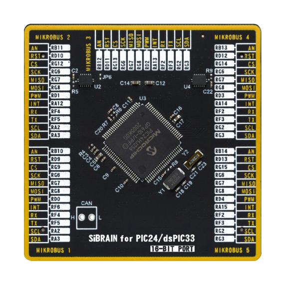MIKROE-4691 is a SIBRAIN for PIC24HJ256GP610. SiBRAIN is a standardized microcontroller add-on board, which allows very simple installation and replacement of the microcontroller unit (MCU) on a development board equipped with the SiBRAIN Card socket. By introducing the new SiBRAIN standard, we have ensured the absolute compatibility between the development board and any of the supported MCUs, regardless of their pin number and compatibility. SiBRAIN is equipped with two 168-pin mezzanine connectors, allowing it to support even MCUs with extremely high pin count. The clever design allows very simple usage, following the well-established plug & play concept of the Click board� line of product.