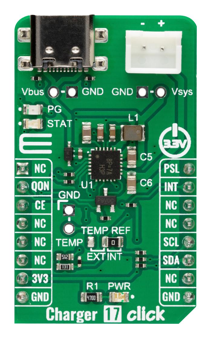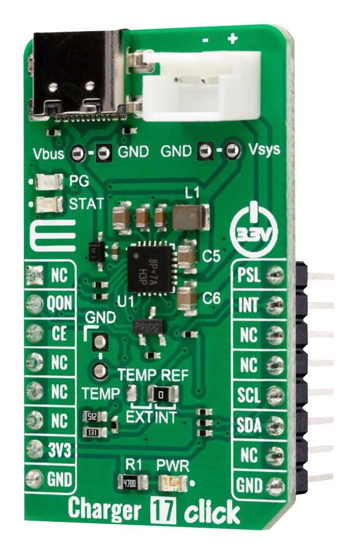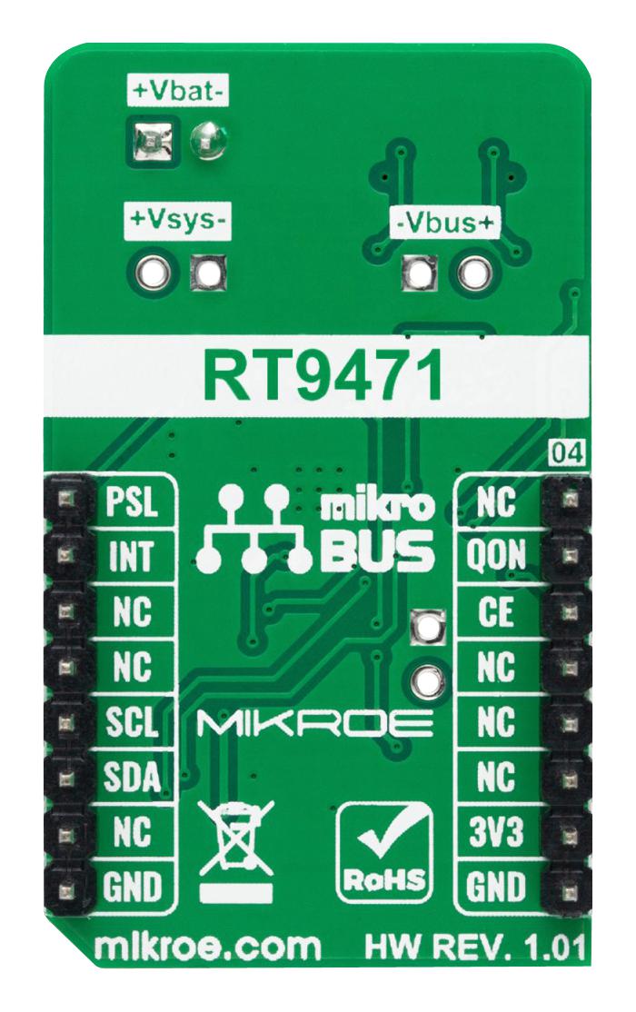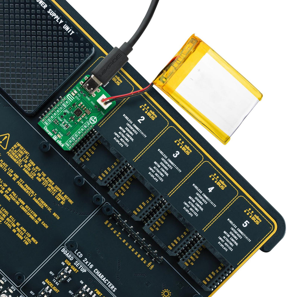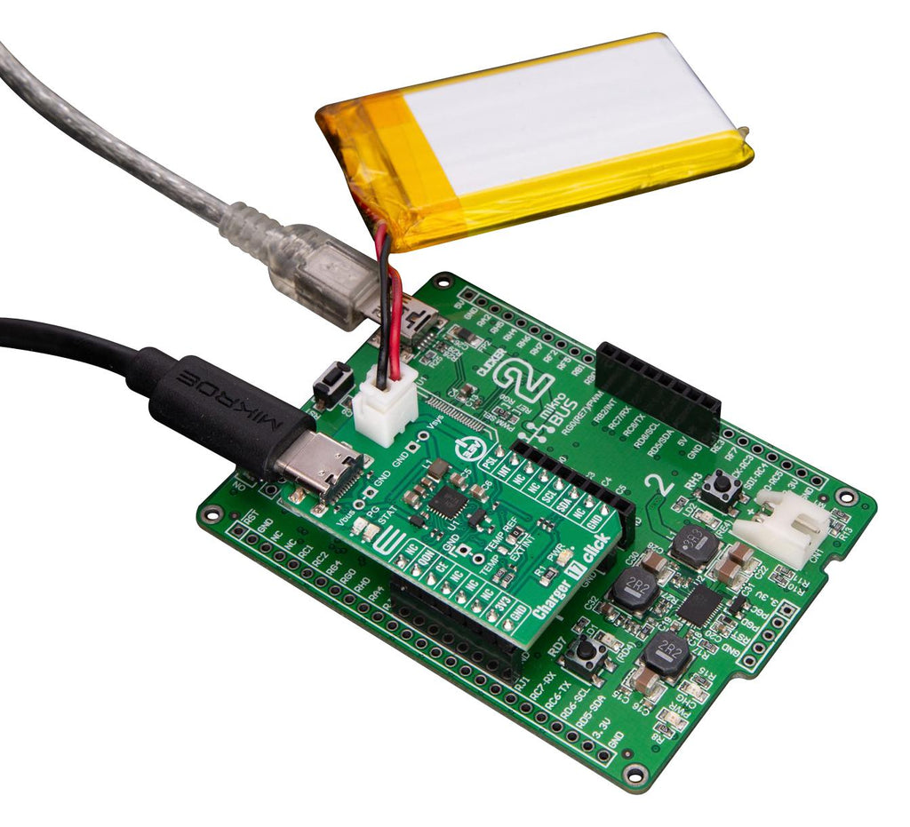 MIKROE-4823 is a Charger 17 Click compact add-on board that provides a single-cell battery charging solution. This board features the RT9471, a 3A single-cell switching battery charger from Richtek. It is a highly-integrated battery charge and system power-path management device for single-cell Li-Ion and Li-Polymer batteries. The high-efficiency 1.5MHz synchronous switch mode buck charger achieves up to 92% charge efficiency at 2A with 5V input and 3.8V battery. This Click board� makes the perfect solution for the development of Li-Ion/Polymer battery chargers for portable devices and accessories, power tools, and more.
