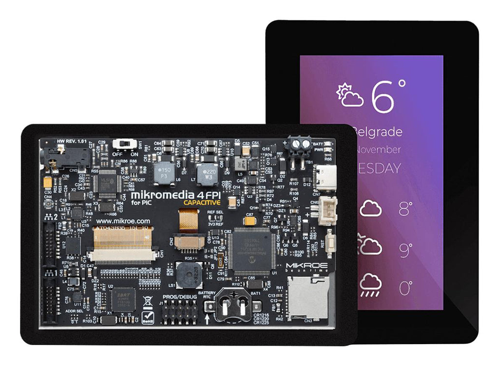 mikromedia 4 for PIC CAPACITIVE FPI with bezel is a compact development board designed as a complete solution for the rapid development of multimedia and GUI-centric applications. By featuring a 4.3" capacitive touch screen driven by the powerful graphics controller that can display the 24-bit colour palette (16.7 million colours), along with a DSP-powered embedded sound CODEC IC, represents a perfect solution for any type of multimedia application. : mikromedia 4 for PIC CAPACITIVE FPI features USB, RF connectivity options, digital motion sensor, piezo-buzzer, battery charging functionality, SD-Card reader, RTC, and much more, expanding its use beyond the multimedia. Two compact-sized mikroBUS Shuttle connectors represent the most distinctive connectivity feature, allowing access to a huge base of Click boards�, growing on a daily basis.