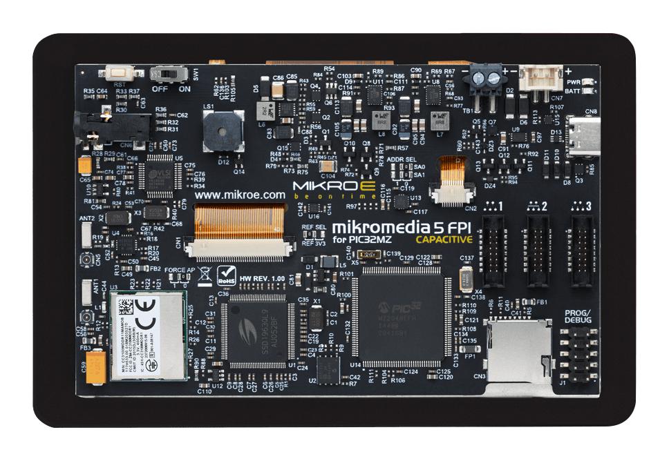 mikromedia 5 for PIC32MZ CAPACITIVE FPI with bezel is a compact development board designed as a complete solution for the rapid development of multimedia and GUI-centric applications. By featuring a 5" capacitive touch screen driven by the powerful graphics controller that can display the 24-bit colour palette (16.7 million colours), along with a DSP-powered embedded sound CODEC IC, represents a perfect solution for any type of multimedia application. The mikromedia 5 for PIC32MZ CAPACITIVE FPI features USB, RF connectivity options, digital motion sensor, piezo-buzzer, battery charging functionality, SD-Card reader, and much more, expanding its use beyond the multimedia. Three compact-sized mikroBUS Shuttle connectors represent the most distinctive connectivity feature, allowing access to a huge base of Click boards�, growing on a daily basis.