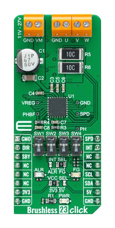 MIKROE-5100 is a brushless 23 click compact add-on board suitable for controlling BLDC motors with any microcontroller. This board features the TC78B011FTG, a three-phase sine-wave PWM predriver realized with six external MOSFETs to drive sensorless brushless motors from Toshiba Semiconductor. Some of the main features are a built-in closed-loop speed control function with internal non-volatile memory (NVM) for speed profile setting and the ability to set other features such as rotation direction selection, brake, Standby mode, and others. It also has a wide operating voltage range of 11V to 27V with an output current capacity of 5A and several built-in error detection circuits. This Click board� provides optimum operational efficiency in applications such as high-velocity server fans, blowers, and pumps. This Click board� comes as a fully tested product, ready to be used on a system equipped with the mikroBUS� socket.