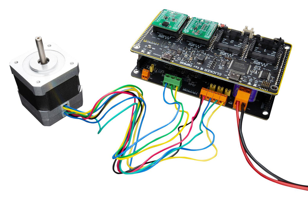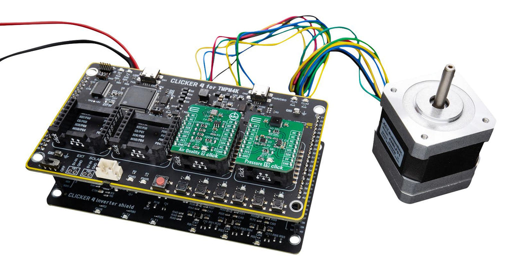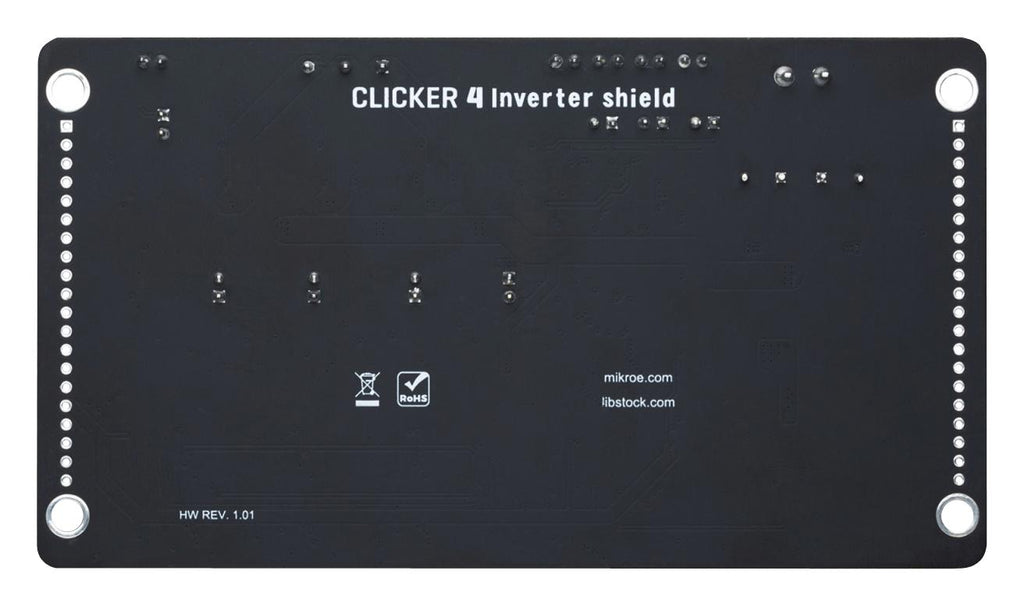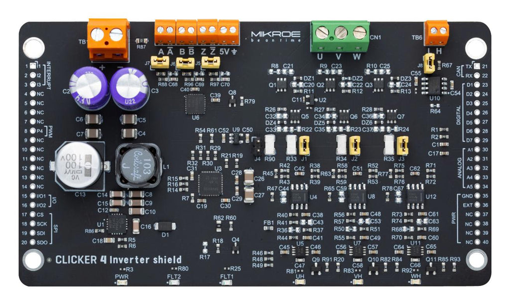 Clicker 4 Inverter Shield is an extension for Clicker 4 series boards from MIKROE. It is the perfect way to expand the functionalities of your Clicker 4 board to provide highly efficient control and drive solutions for brushless DC (BLDC) motors. The board features a 3-phase inverter using Toshiba's low RDS(ON) power MOSFETs, used in combination with an integrated gate driver easily configurable through the SPI interface. It also carries an incremental encoder receiver, and a CAN transceiver, rounding out the functionality of the board ideal for various motor control applications.