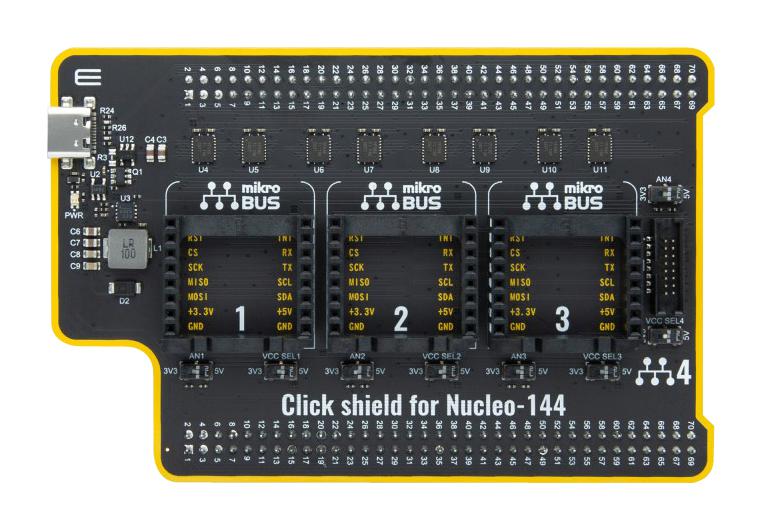 MIKROE-5487 is a Click shield for nucleo-144 perfect way to expand development board's functionalities with STM32 Nucleo-144 pinout. It provides four mikroBUS� sockets, with one in the form of a Shuttle connector, to add any functionality from our ever-growing range of Click boards�. It is fully stocked with everything, from sensors and Wi-Fi transceivers to motor control and audio amplifiers. This is compatible with the STM32 Nucleo-144 boards, providing an affordable and flexible way for users to try out new concepts and build prototypes with the STM32 microcontrollers from various combinations of performance, power consumption, and features. Board do not require any separate probe as they integrate the ST-LINK debugger and programmer alongside the comprehensive free software libraries. Click Shield for Nucleo-144 allows you to use Click boards� on your STM32 Nucleo-144 boards.