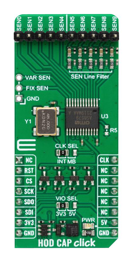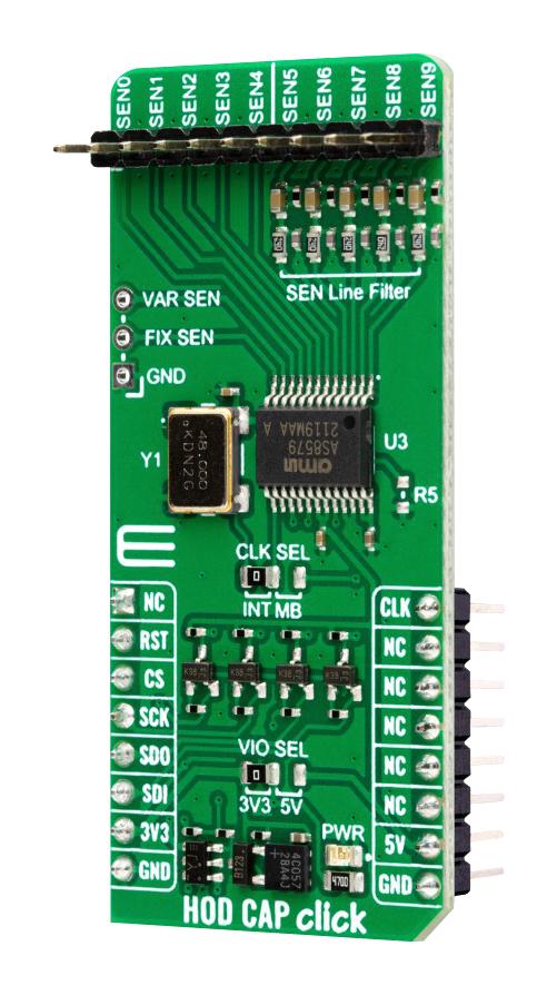 MIKROE-5719 is a HOD CAP Click compact add-on board that adds a smart sensing solution to your application. This board features the AS8579, a capacitive sensor from ams OSRAM. The sensor features I/Q signal demodulation, parasitic influences from cable, and PCB protection. It has ten sense outputs, five of which come with sensing line filter circuits. This Click board� makes the perfect solution for the development of autonomous driving applications such as hands-on steering wheel detection and detection of any human presence inside a vehicle or outside of the vehicle, e.g., for automatic trunk opener and more. HOD CAP Click is supported by a mikroSDK compliant library, which includes functions that simplify software development. This Click board� comes as a fully tested product, ready to be used on a system equipped with the mikroBUS� socket.