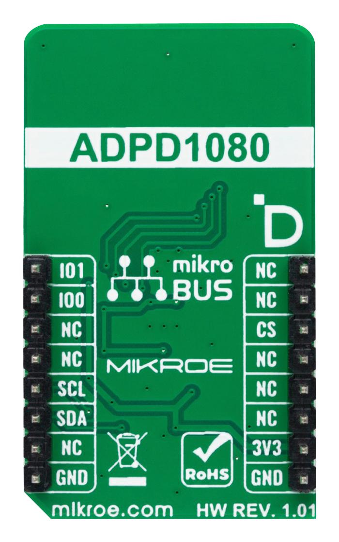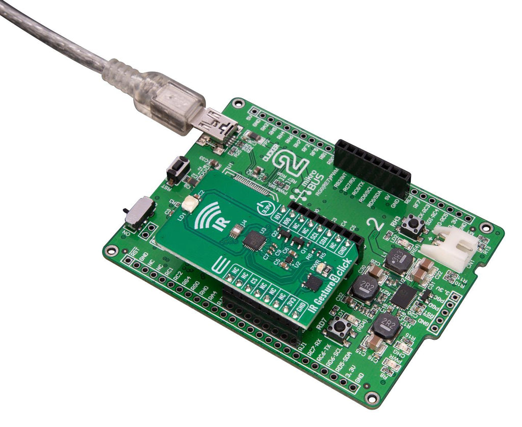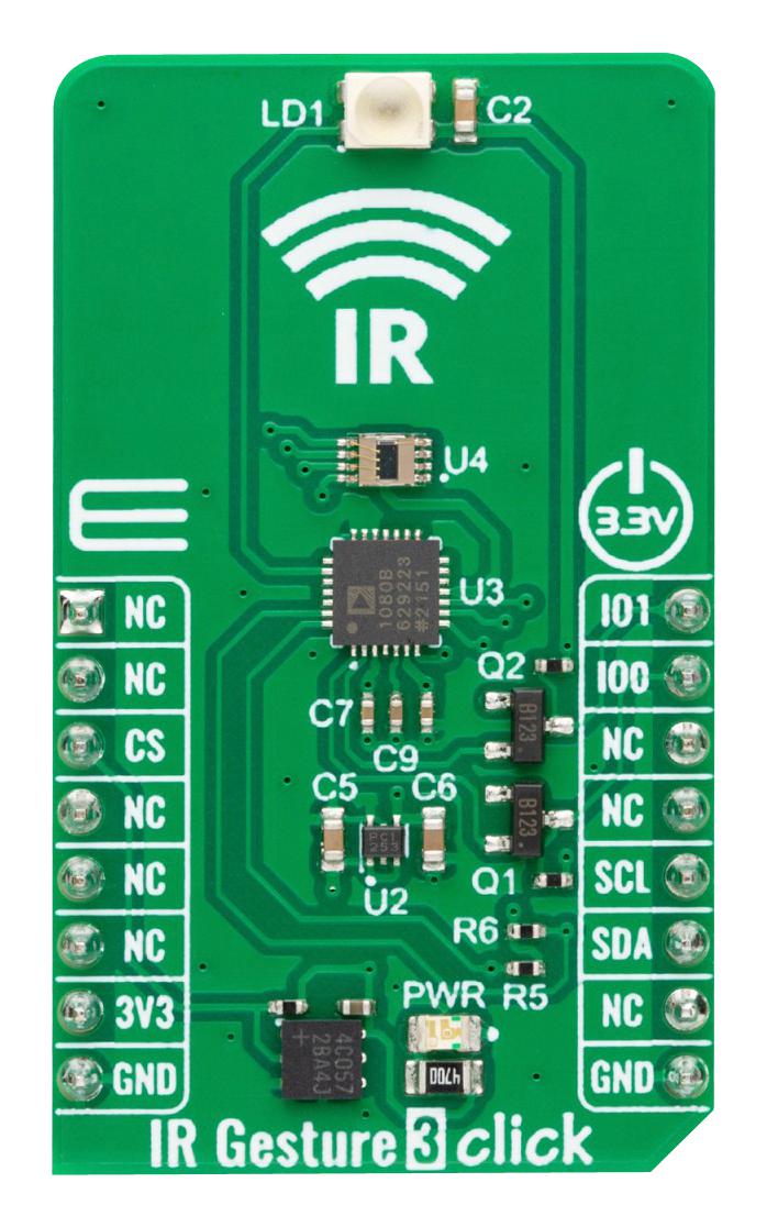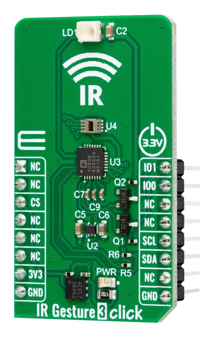 MIKROE-5742 is a IR Gesture 3 Click compact add-on board that provides contactless gesture recognition. This board features the ADPD1080, a photometric front-end from Analog Devices. The IR Gesture 3 click allows gesture recognition in two dimensions, with a built-in optical filter and a sharp visible light cut-off. It eliminates the need for external lenses and preserves the dynamic range of the sensor when placed under sunlight or indoor lighting. It does not require a precise alignment because its sensor maintains a linear response within the ±35° angular field of view. This Click boardâ�¢ makes the perfect solution for the development of various gesture sensing applications, from hand swipe gestures (left, right, up, down, wave), air click, and flicks to multizone proximity detection.