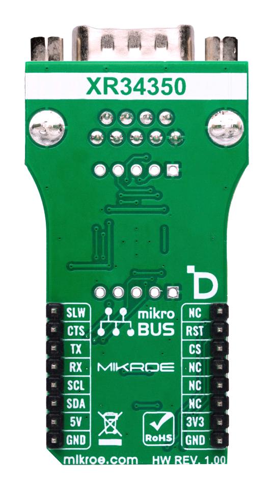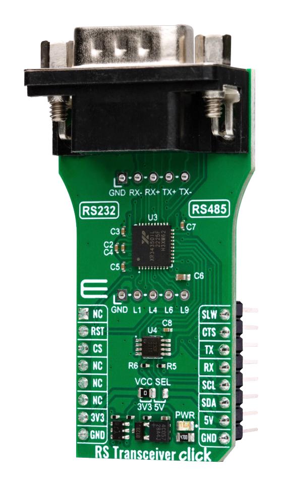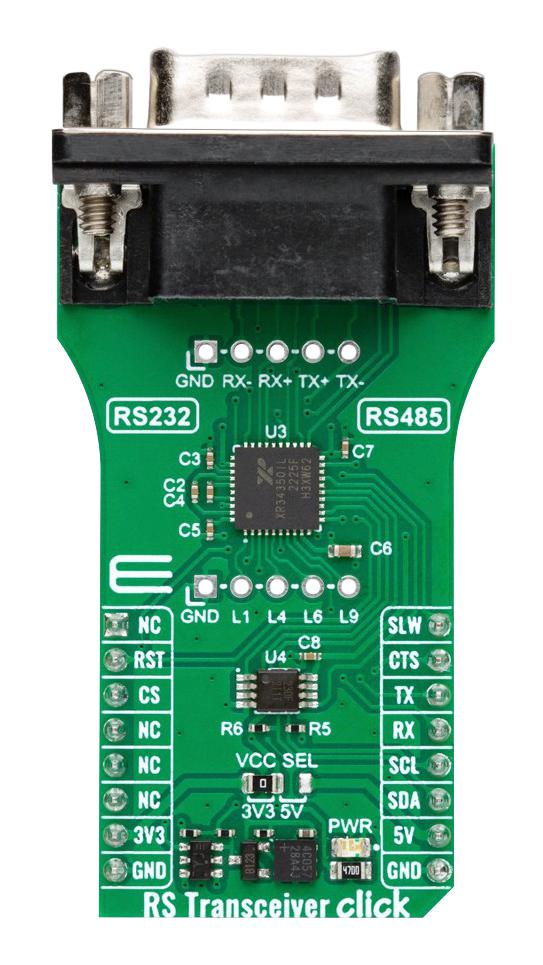 MIKROE-5746 is a RS transceiver compact add-on board that offers an interface between the TTL level UART and RS-232/RS-422/RS-485 communication buses. This board features the XR34350, an RS-232/RS-422/RS-485 serial transceiver with internal termination and wide output swing from MaxLinear. Integrated cable termination and four configuration modes allow all three protocols to be used interchangeably over a single cable over the DE-9 connector. All transmitter outputs and receiver inputs feature robust ESD protection and HBM up to ±15KV. This Click boardâ�¢ makes the perfect solution for the development of low-power serial communications, portable serial devices, point-of-sale equipment, HVAC systems, building automation, and many more applications. RS transceiver is supported by a mikroSDK compliant library, which includes functions that simplify software development. This Click boardâ�¢ comes as a fully tested product, ready to be used on a system equipped with the mikroBUSâ�¢ socket.