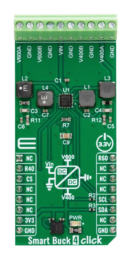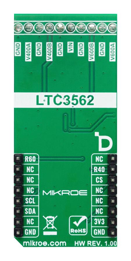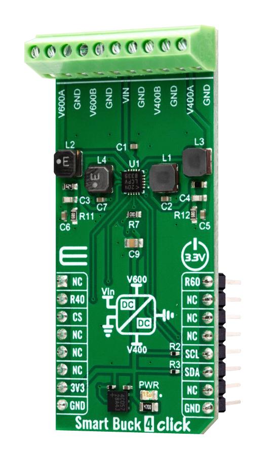 MIKROE-5750 is a smart buck 4 Click compact add-on board that contains a high-frequency synchronous step-down DC-DC converter. This board features the LTS3562, a quad synchronous step-down DC-DC regulator from Analog Devices. It uses voltages in the range of 2.85V up to 5.5V as input. As output, the converter can scale voltage from 425mV up to 3.755V in 25mV steps, retaining up to 600mA of output current, operating at 2.5MHz of the typical switching frequency. This Click board� makes the perfect solution for the development of DSPs power supplies, portable devices, dynamic voltage scaling, and more. Smart Buck 4 Click is supported by a mikroSDK compliant library, which includes functions that simplify software development. This Click board� comes as a fully tested product, ready to be used on a system equipped with the mikroBUS� socket.