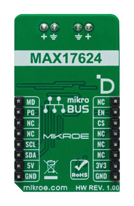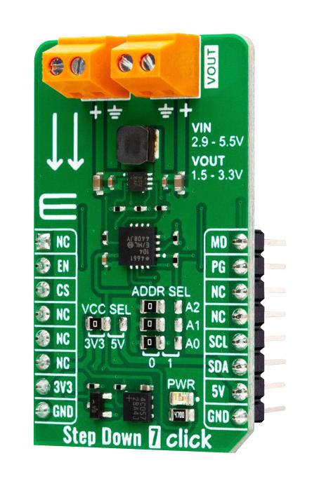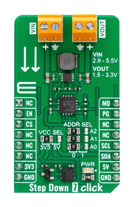 MIKROE-5754 is a step down 7 Click compact add-on board that converts higher voltages into a lower voltages level. This board features the MAX17624, a synchronous step-down converter with integrated MOSFETs from Analog Devices. The converter, as input, uses voltages in the range from 2.9V up to 5.5V and can output step-down voltages from 1.5V to 3.3V up to 1A. It features high efficiency, and depending on the mode of operation, it works at a fixed 4MHz switching frequency. In addition, it comes with undervoltage lockout, overcurrent protection, and thermal overload protection. This Click board� makes the perfect solution for the development of power conversion solutions in automation and control applications, industrial sensors, test and measurement equipment, portable low-power devices, and more. Step Down 7 Click is supported by a mikroSDK compliant library, which includes functions that simplify software development.