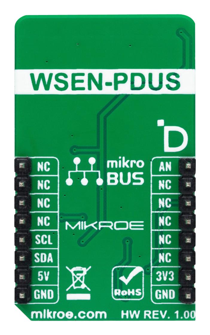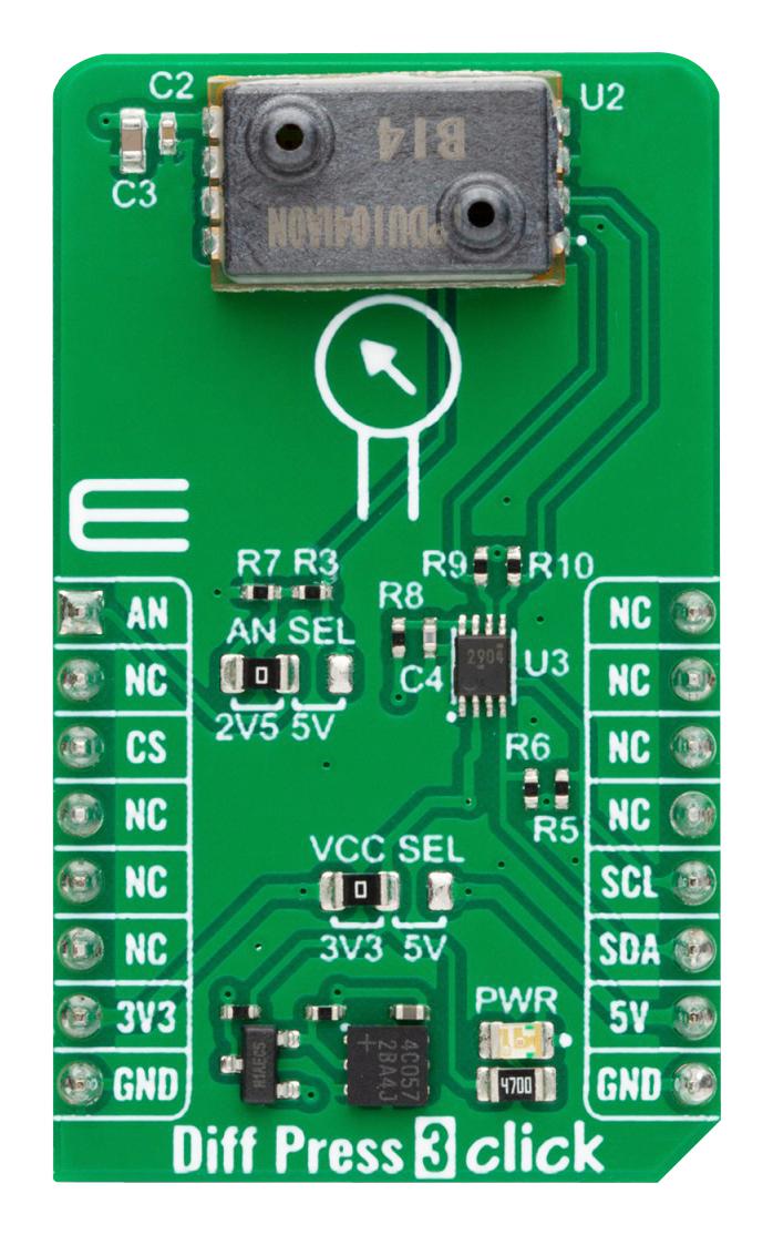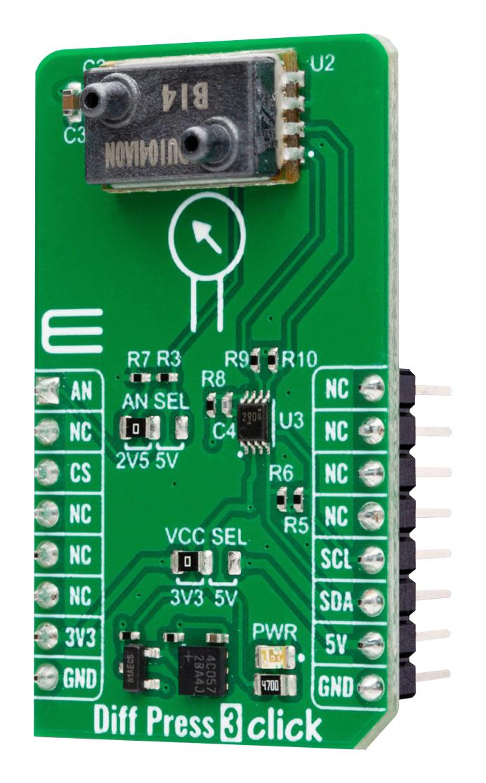 MIKROE-5771 is a Diff Press 3 Click compact add-on board that can measure differential pressure. It features the WSEN-PDUS (2513130810401), a differential pressure sensor from Würth Elektronik. The sensor is MEMS based and uses a piezo-resistive sensing principle. It is a fully calibrated pressure sensor with 15-bit digital and 11-bit analogue outputs. In addition to pressure measurement, the 2513130810401 WSEN-PDUS sensor also has an embedded temperature sensor. This Click board� makes the perfect solution for the development of HVAC, filter monitoring, gas leak detection applications, and more.