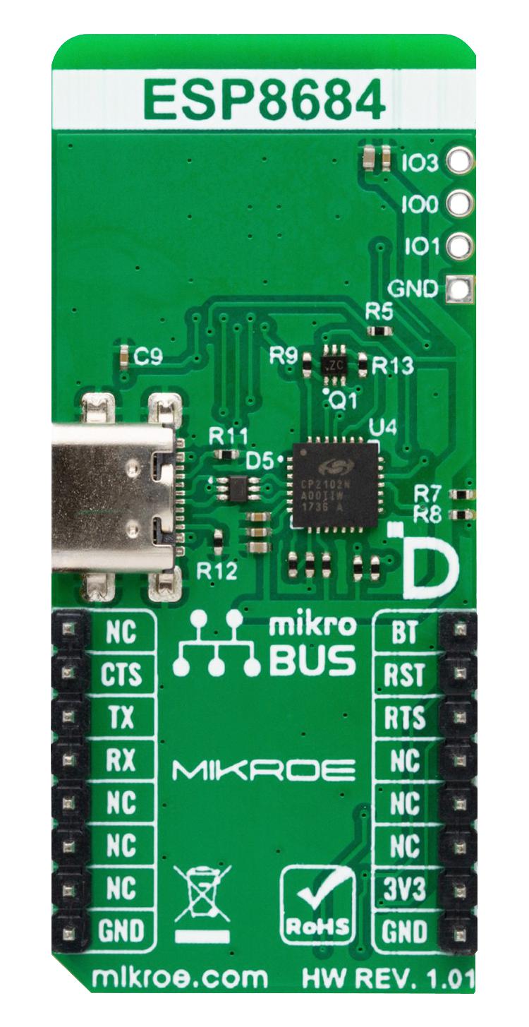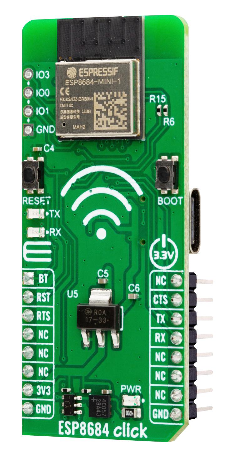 MIKROE-5803 is a ESP8684 Click compact add-on board that contains a wireless combo module. It features the ESP8684-MINI-1, a highly integrated Wi-Fi, and a Bluetooth 5 module from Espressif Systems. It simultaneously supports BSS in Station mode, SoftAP mode, Station + SoftAP mode, and promiscuous mode. As for the Bluetooth 5, the module supports central role and peripheral role. In addition, ESP8684 Click allows you to upgrade or upload your custom software on the ESP8684 module over the USB C connector. This Click board� makes the perfect solution for the development of smart home applications, industrial automation, consumer electronics, health care, smart agriculture, and more. ESP8684 Click is supported by a mikroSDK compliant library, which includes functions that simplify software development. This Click board� comes as a fully tested product, ready to be used on a system equipped with the mikroBUS� socket.
