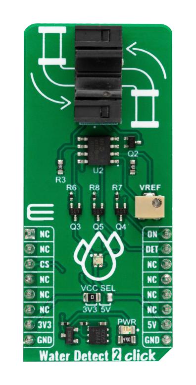 MIKROE-5820 is a water detect 2 click compact add-on board that can detect the presence/flow of a liquid in a clear tube. This board features the OPB350L250, a tube liquid sensor from TT Electronics. Water Detect 2 Click has multiple output states and can recognize fluid present, no fluid present, and no tube present. This sensor excepts 1/4� tubing (6.3mm) as an outside diameter of the clear tubes, regardless of the direction of the liquid�s flow. This Click board� makes the perfect solution for the development of non-contact fluid sensing, IV fluid, oils, and other petroleum products sensing applications, coloured fluids, toner fluids, water, and more. Water Detect 2 Click is supported by a mikroSDK compliant library, which includes functions that simplify software development. This Click board� comes as a fully tested product, ready to be used on a system equipped with the mikroBUS� socket.