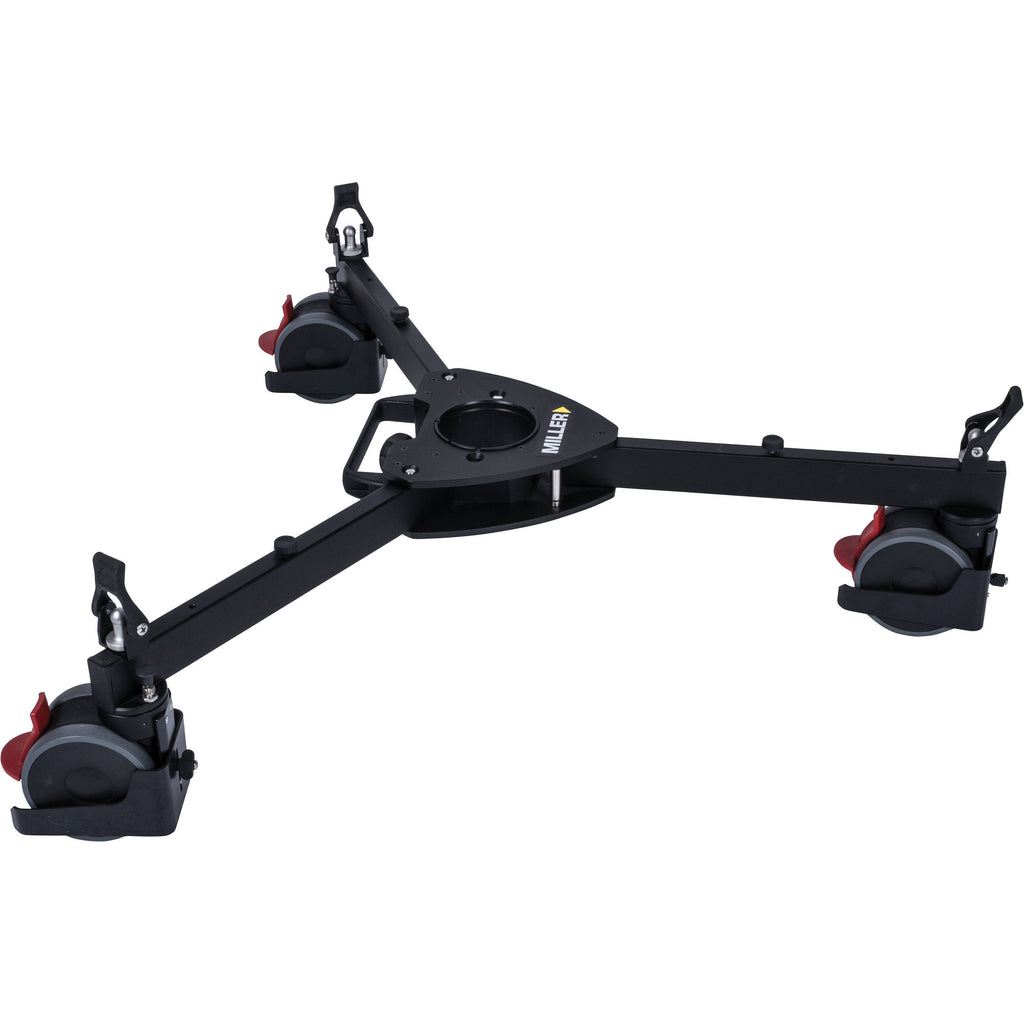 The Miller HD Dolly for HD and Sprinter II Tripods provides a stable platform for smoothly rolling your tripod along a studio floor. The three dual ball bearing wheels let the dolly quickly swivel as necessary, while the robust design can support payloads up to 440 pounds. Each wheel has a cable guard to push cables out of the way rather than roll over them, and an axle brake for quickly latching and unlatching for camera movement. Wheels can be repositioned and locked to carry out linear or radial movements. When not in use, the HD Dolly can be quickly folded and transported via the built-in handle.