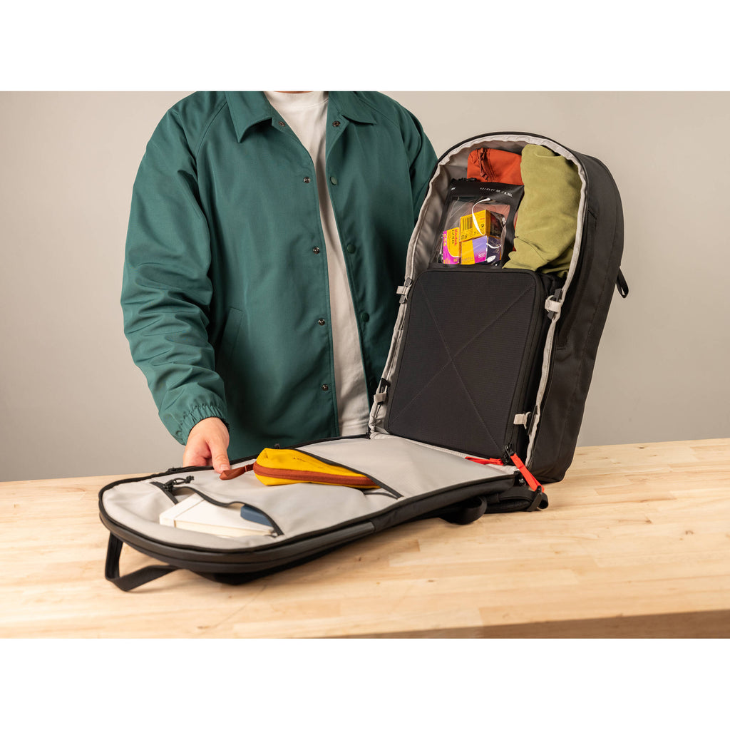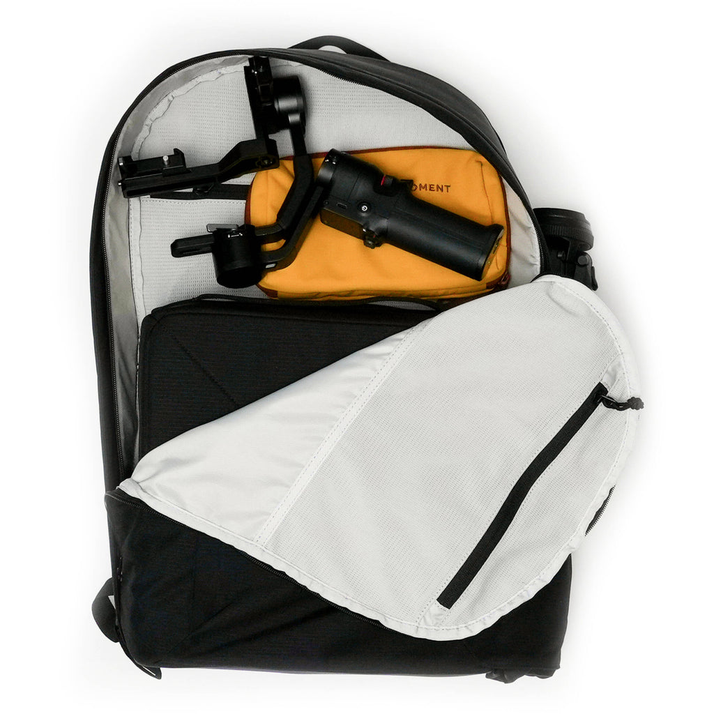 The black 28L Everything Backpack from Moment can be used as a daily backpack or a weekend traveler. This pack is versatile and can carry a variety of items such as cameras, laptops, tablets, everyday accessories, and overnight items. The everything backpack has side, top, and full body access, making it easy to pack, organize, and access your gear. This pack is also compatible with Moment's 4L and 8L camera inserts, which are sold separately.
