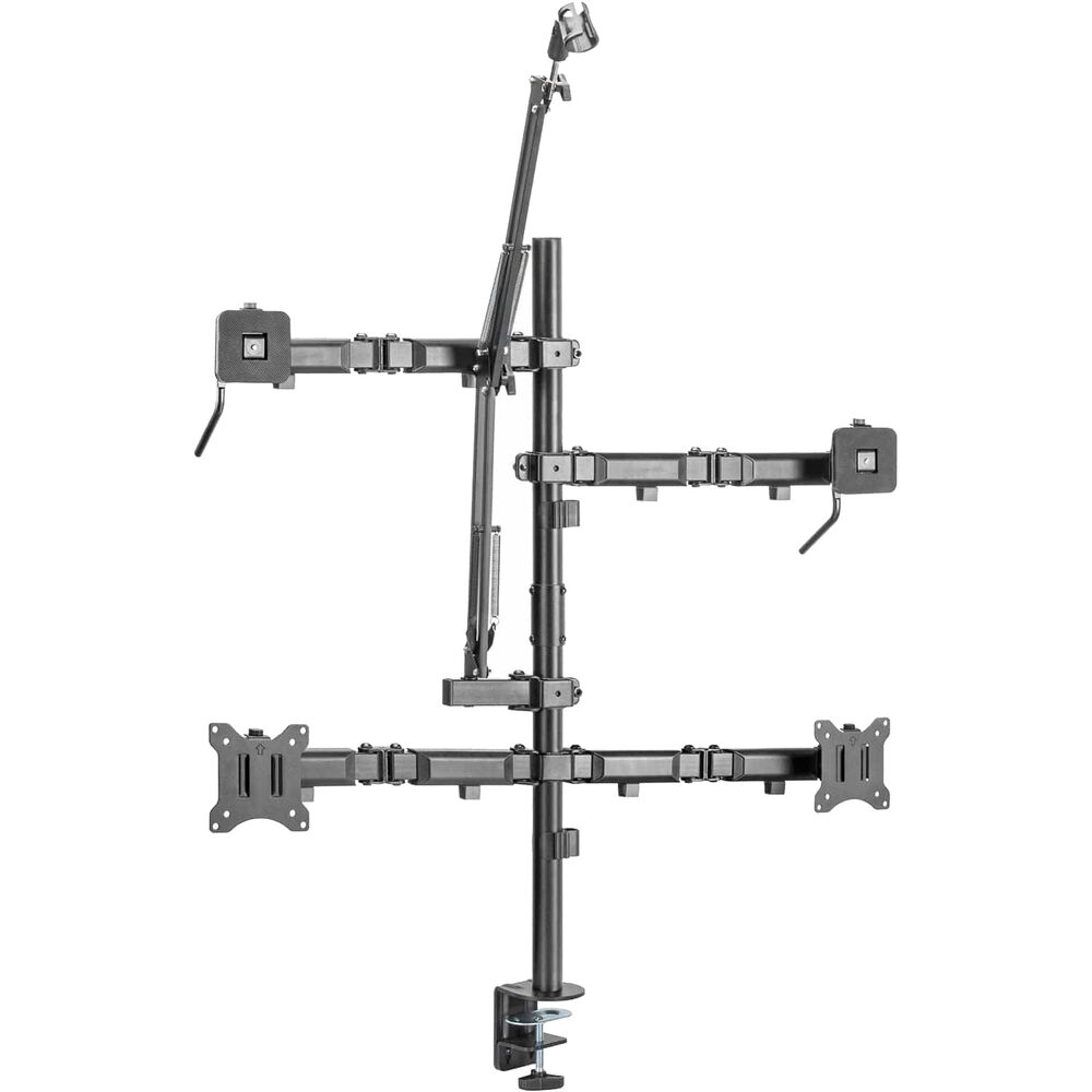 The Mount-It! All-In-One Studio Mount for Dual Displays is a space-saving, fully articulating desk mount capable of holding monitors up to 32" and 19.8 lb, along with a camera, ring light, and microphone. Each arm has a full range of motion for adjusting height, tilt, and swivel to find your ideal position. Steel construction provides reliable durability.