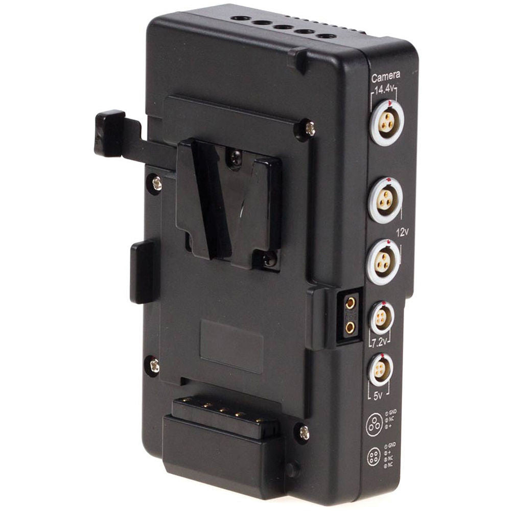 Featuring a male V-mount adapter on one side and female on the other, this Movcam Distribution Box is designed to sandwich in between a camera's V-mount and a V-mount battery and to provide several output ports for powering devices and accessories. It can also be used rod-mounted via an optional Movcam 15mm rod bracket (model # MOV-306-0214), which attaches on the bottom and positions the unit upright.
