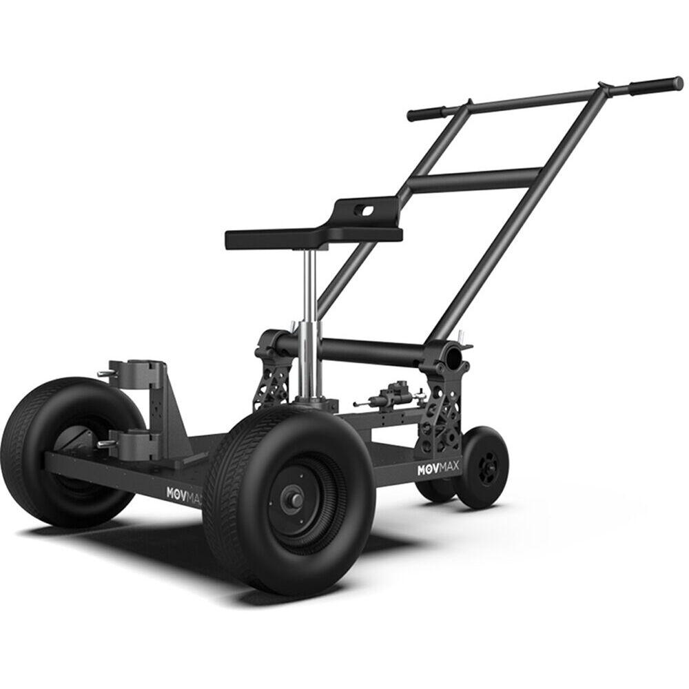 MOVMAX without needing to lay down a designated track, thanks to the rickshaw's large front tires. The entire rig supports a total weight of 330.7 lb to accommodate both a seated operator and a large camera rig. Modular components make up the rickshaw's design with detailed instructions and templates on the baseplate for assembly. Both the operator and the camera can be pushed or pulled by a grip to facilitate complex tracking shots.