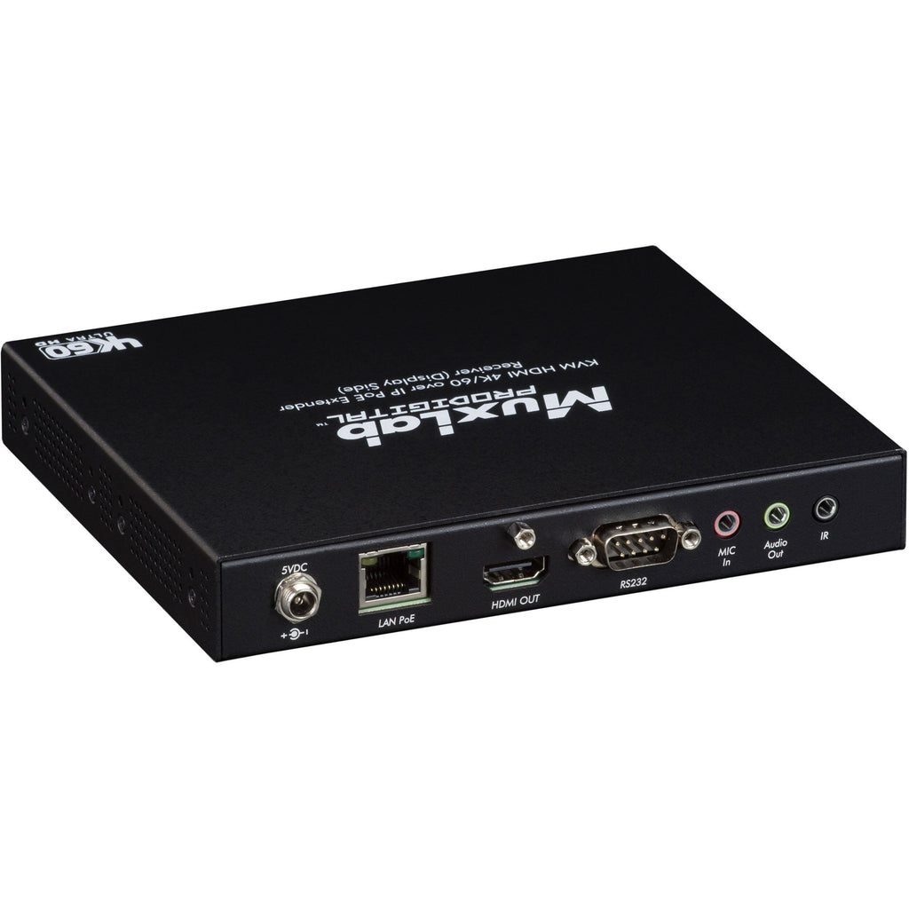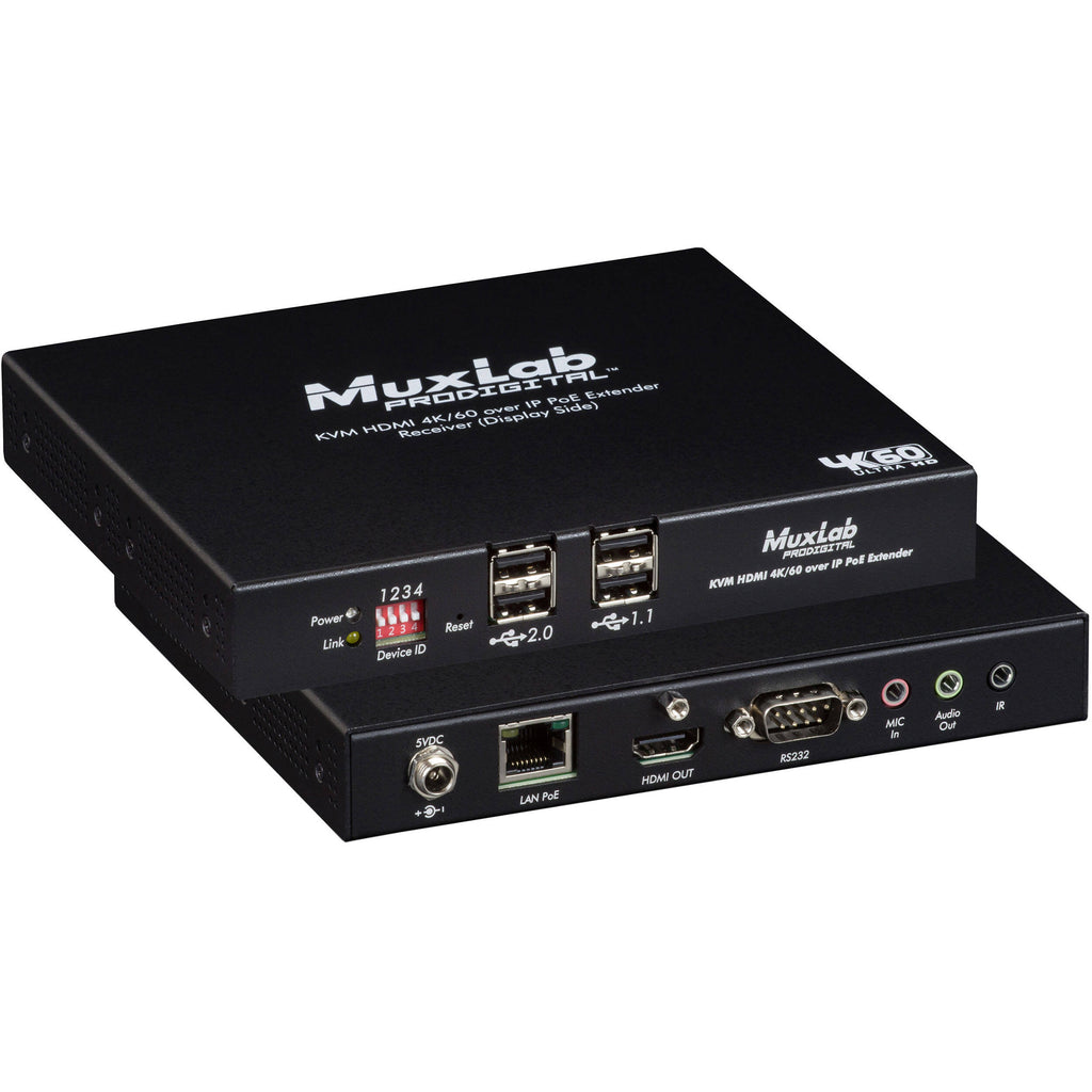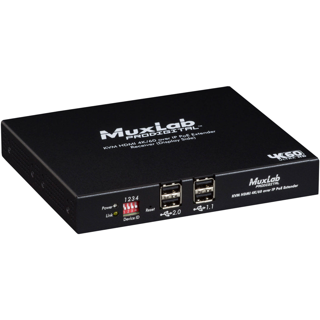 The MuxLab 4K/60 KVM HDMI over IP PoE Receiver allows HDMI & USB equipment to be connected up to 330' over an Ethernet LAN, supports HDMI up to 4K @ 60Hz (4:4:4) via Cat5e/6 cable in multiple point-to-point and point-to- multipoint configurations. The Receiver (500800-RX) supports PoE (PD) if used with a PoE (PSE) Ethernet Switch.